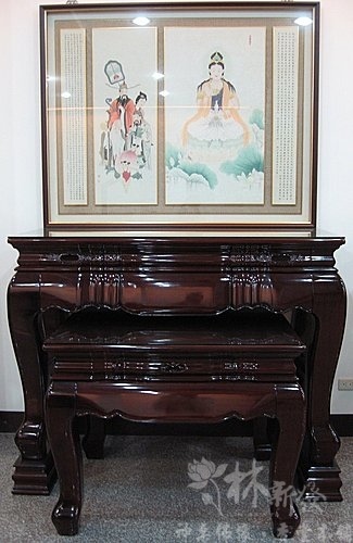 神明聯:半手繪綢布一尊觀音+財子壽;神桌:紫檀素面新式神桌(古銅色)