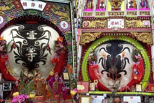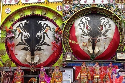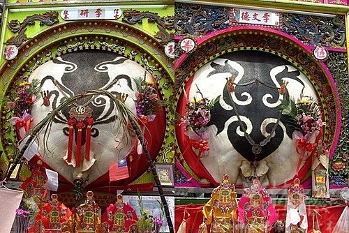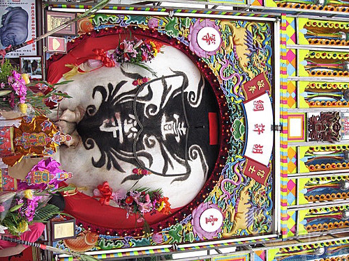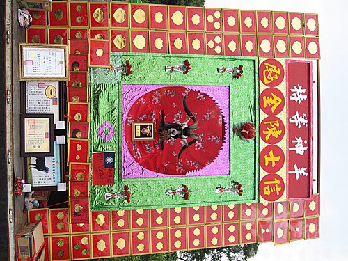 神豬前擺的香案及供品,也是超級豐盛,還看見掛有活的鯉魚,雞鴨魚肉水果及壽桃,更是多不勝數