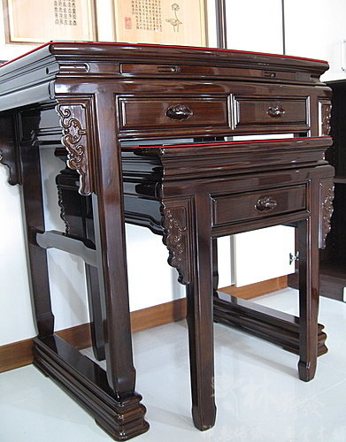 神桌-三尺六紫檀明式(古銅色)+觀自在福祿壽雕刻聯&五尺一紫檀桶桌+立體框彩繪觀音聯(土城學府路留檔)