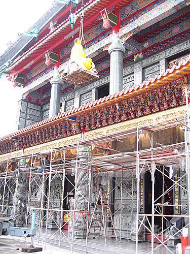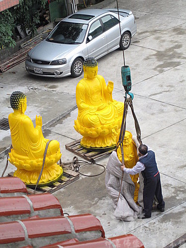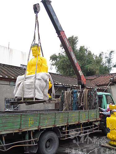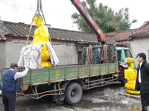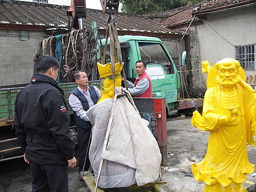 到廟裡後開始準備要把神像吊到樓上去