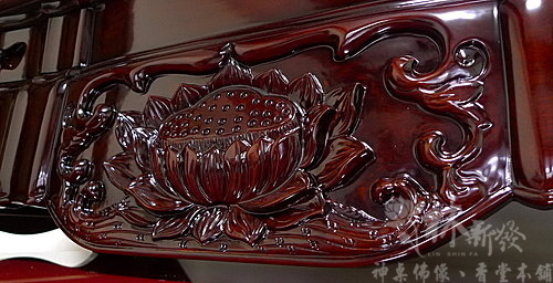 這組是以傳統大溪神桌做法為基底,但師父特別在神桌上下桌中間部分雕刻上立體蓮花,