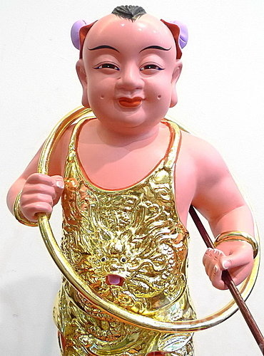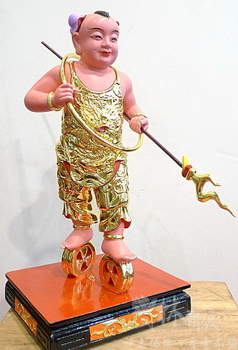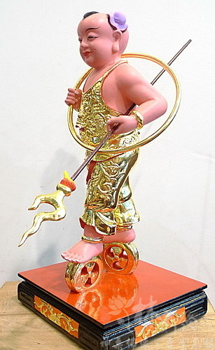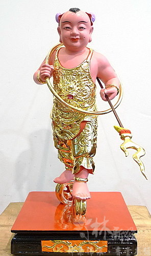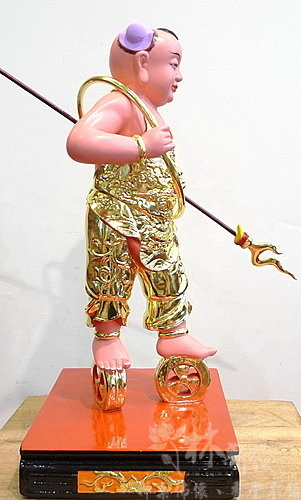 左手法器太子槍,角度微微朝下。赤腳踏風火輪。