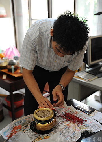 香灰撒了不少出來^^~~丫倫要把爐清乾淨~再留下三支香腳傳承~