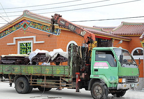 這次送桌與配件一共出動了,吊車一輛、大貨車一台與林新發的小發財一台喔~