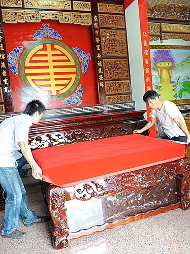 再撲上大紅色的紅絨布~ 不但喜氣還象徵著大吉大利,更可以保護神桌的桌面喔!
