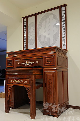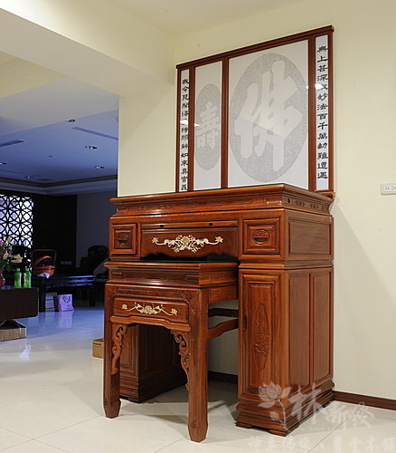 神桌-五尺一花梨木桶桌+特殊大佛(心經)大壽(淨土咒)神聯