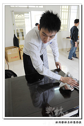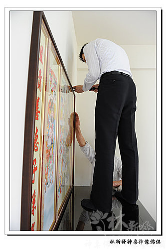丫倫正認真的將玻璃擦的亮晶晶囉~每一組神桌到客人家,丫倫都會視為在自己家的神明廳一樣~