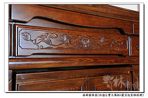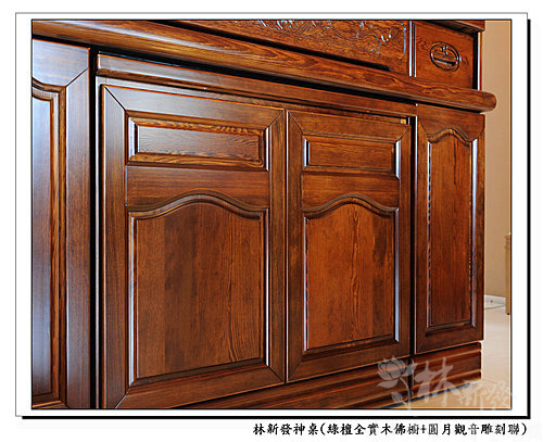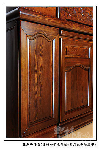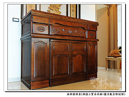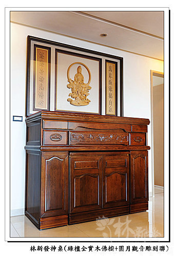 佛櫥式神桌+圓月觀音雕刻聯的感覺,這組是綠檀實木佛櫥~簡單的說是要讓人用超過100年的實木神桌唷~