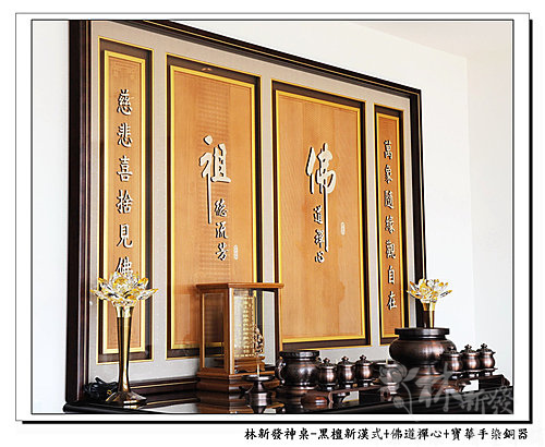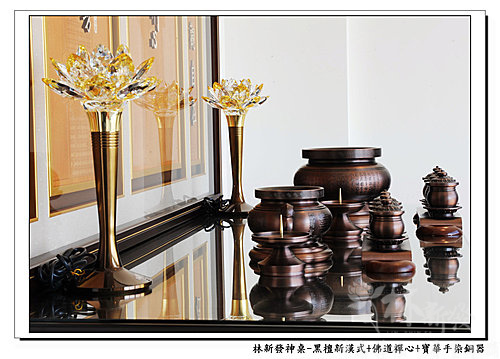 五尺一純正黑檀漢式神桌+佛道禪心雕刻聯+寶華最新手染系列銅器+LOTUS金黃水晶燈(北投林先生)