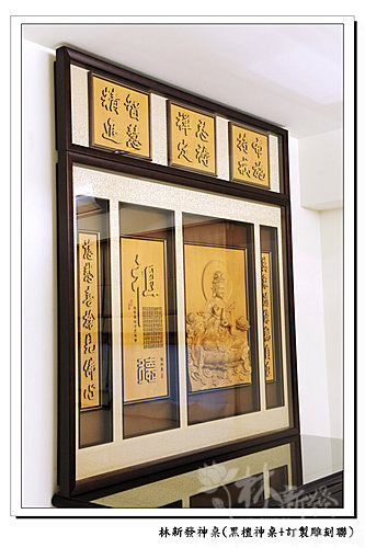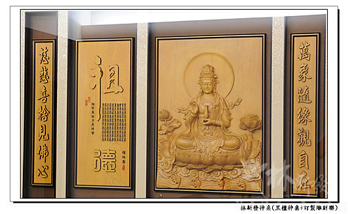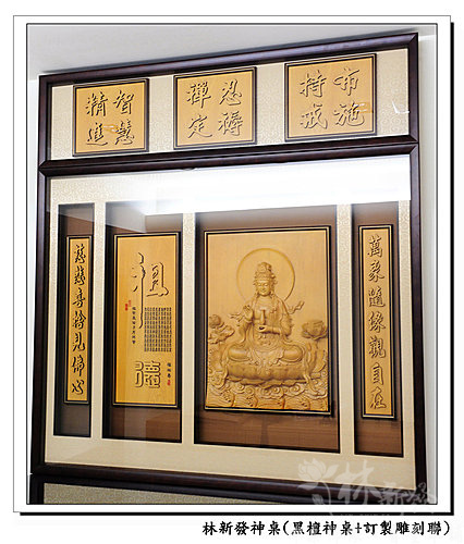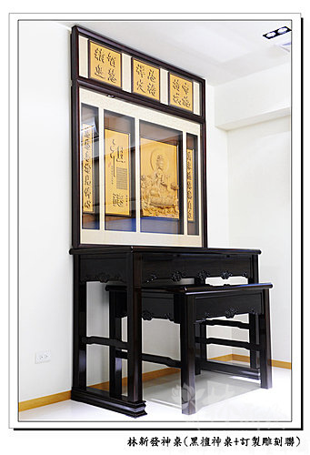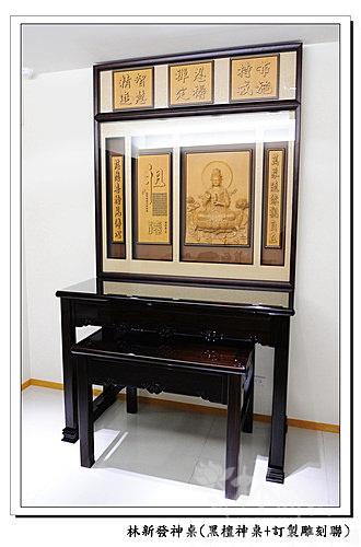 黑檀神桌配上觀音雕刻聯~最特別的應該是上面的檜木雕刻字叭: