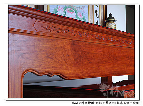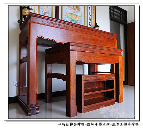 國師手藝全素面直接神桌加雕花,配上特別訂製的"龍尊王佛"手繪神聯~