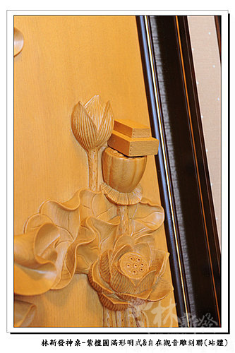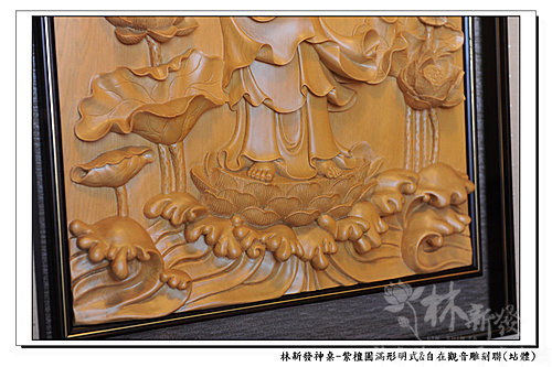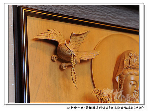 站姿自在觀音雕刻聯是客製化的木雕雕刻聯~神聯上雕刻了大鵬鳥跟普門品,而觀音以站姿立於蓮花水景之上