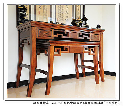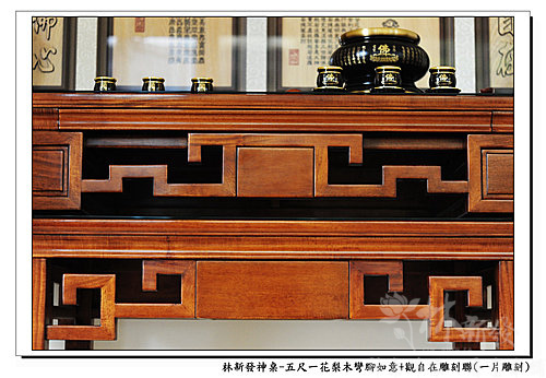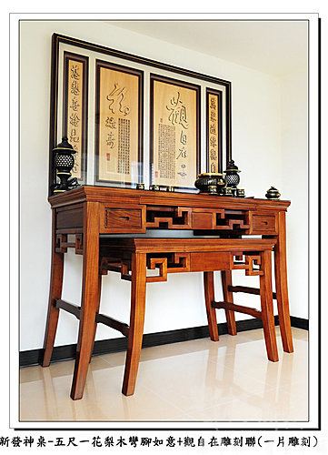 神桌神聯-五尺一花梨木彎腳如意神桌+觀自在雕刻聯(古殿古色佛爐)