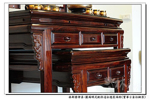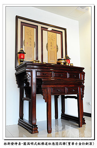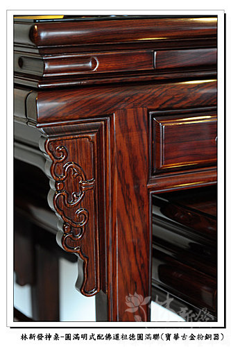 神桌神聯-佛道祖德圓滿雕刻聯、圓滿明式神桌(寶華古金粉銅器)