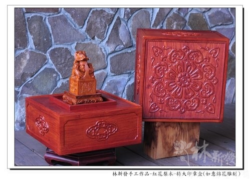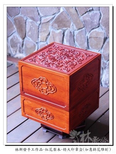 林新發手工作品-紅花梨木-特大宮廟印章盒(如意錦花雕刻)