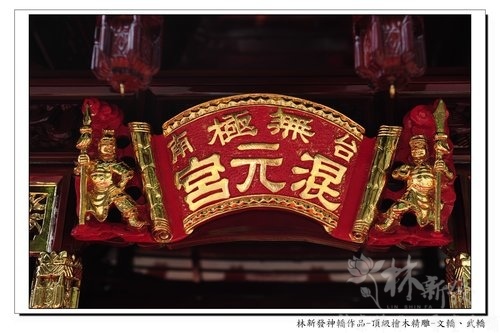 神轎上的宮名配上兩個將軍雕刻,紅底按金後,整個就是有氣勢