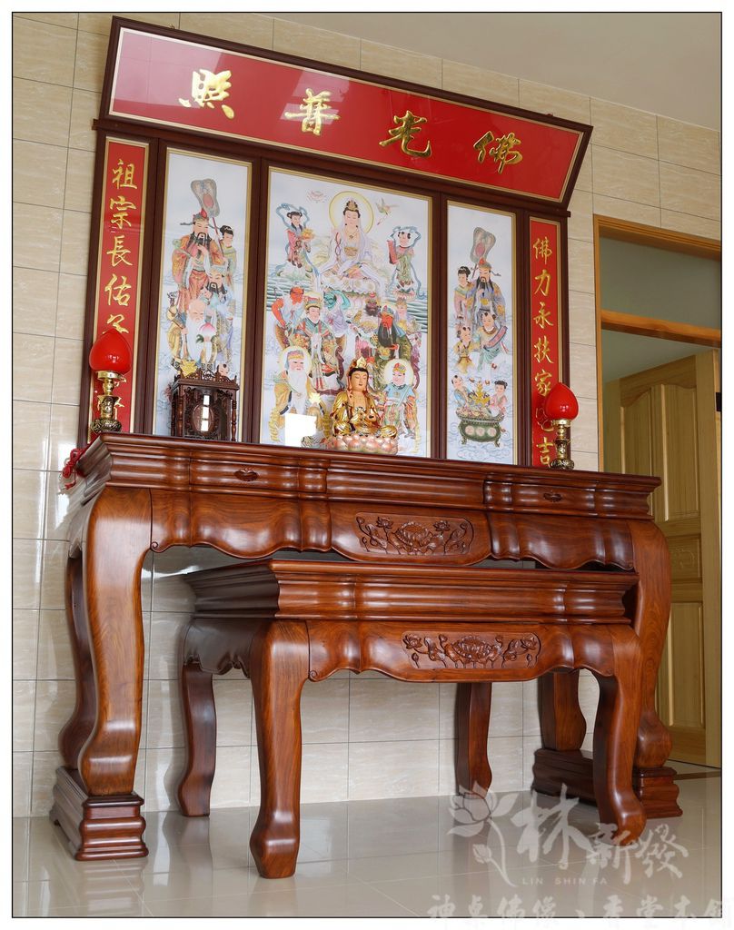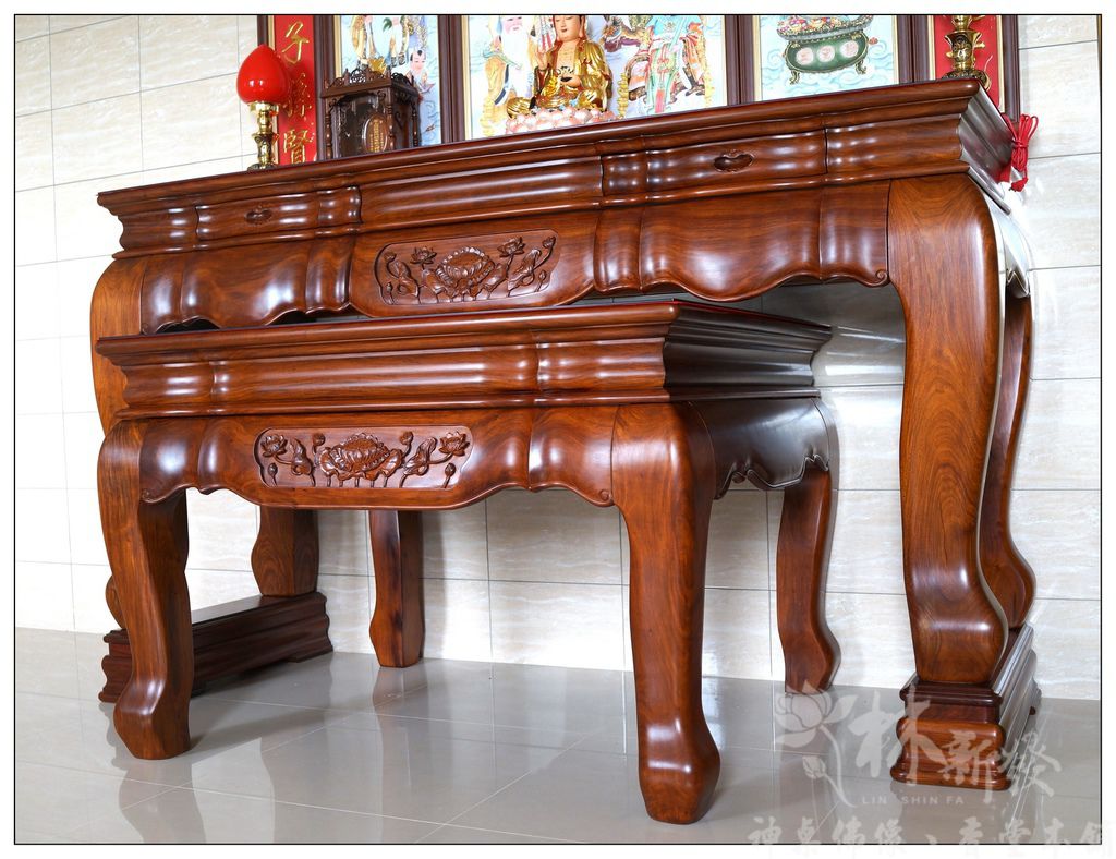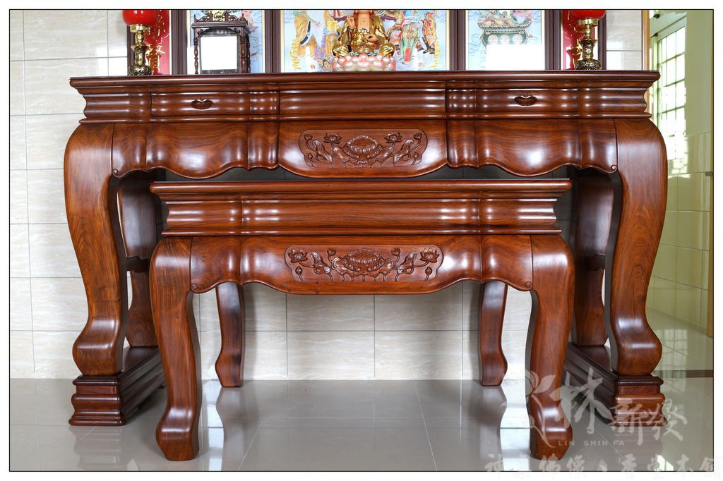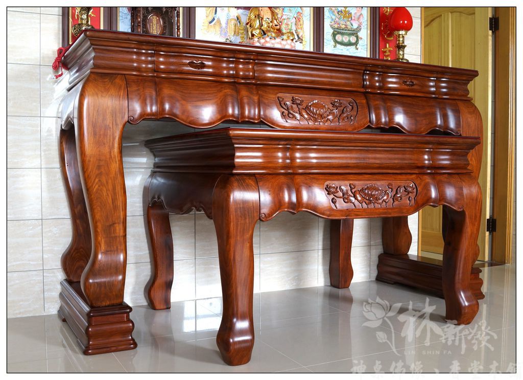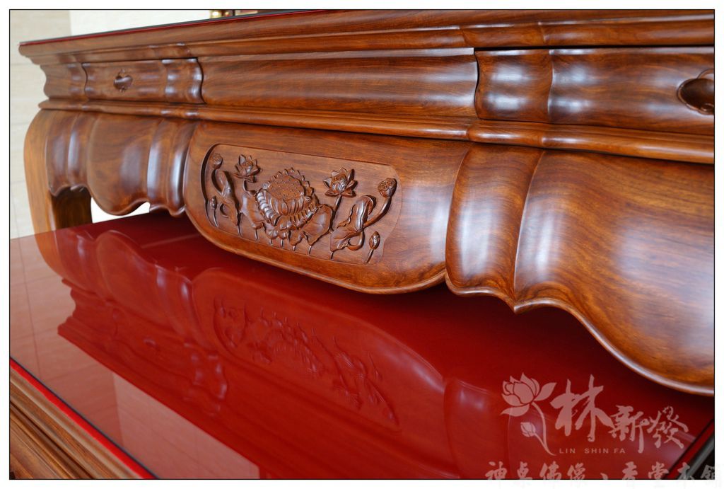 居家用的最大尺寸七尺神桌,在林新發有數十組供人選擇,材質從純正黑檀、紫檀、花梨木、黑紫檀、烏心石、黃金檀、紅檀等,想得到的木材我們都有客製化