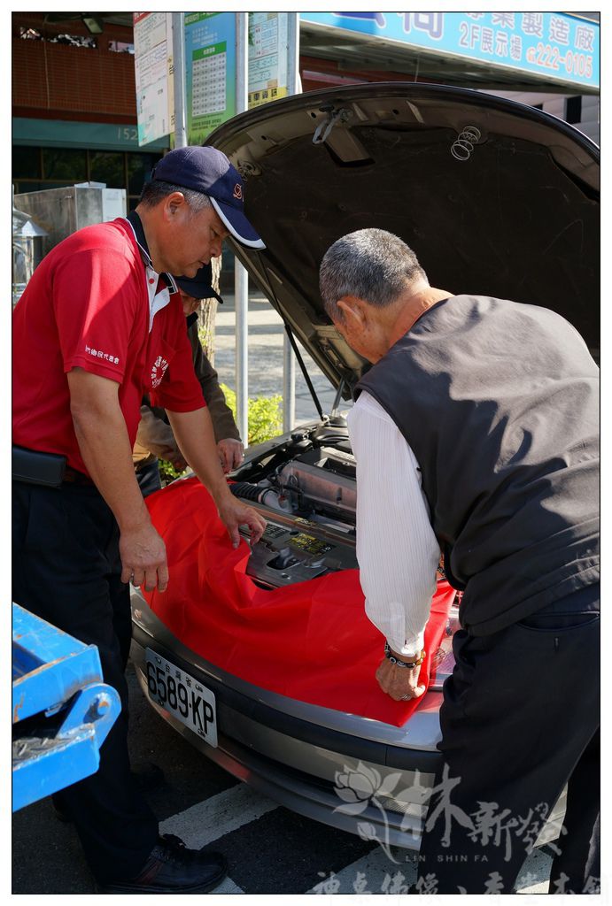 廟裡的主委來林新發,要先幫迎神的車子結上紅彩
