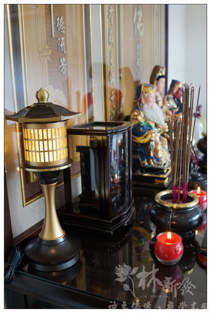 所用的佛俱,是古壂銅器出品的最高等級佛字心經神爐,配上寶華銅器出品的富貴神舍燈,最頂規的佛俱,都在林新發神桌佛俱。
