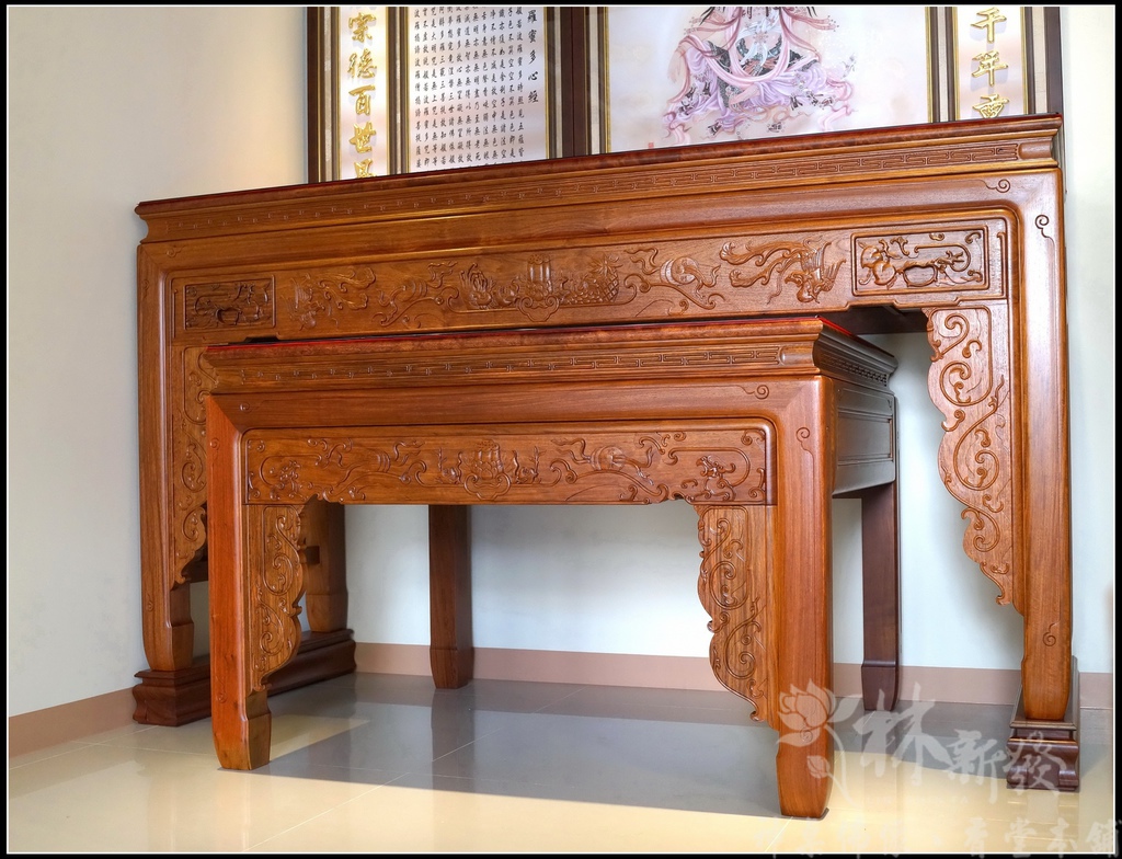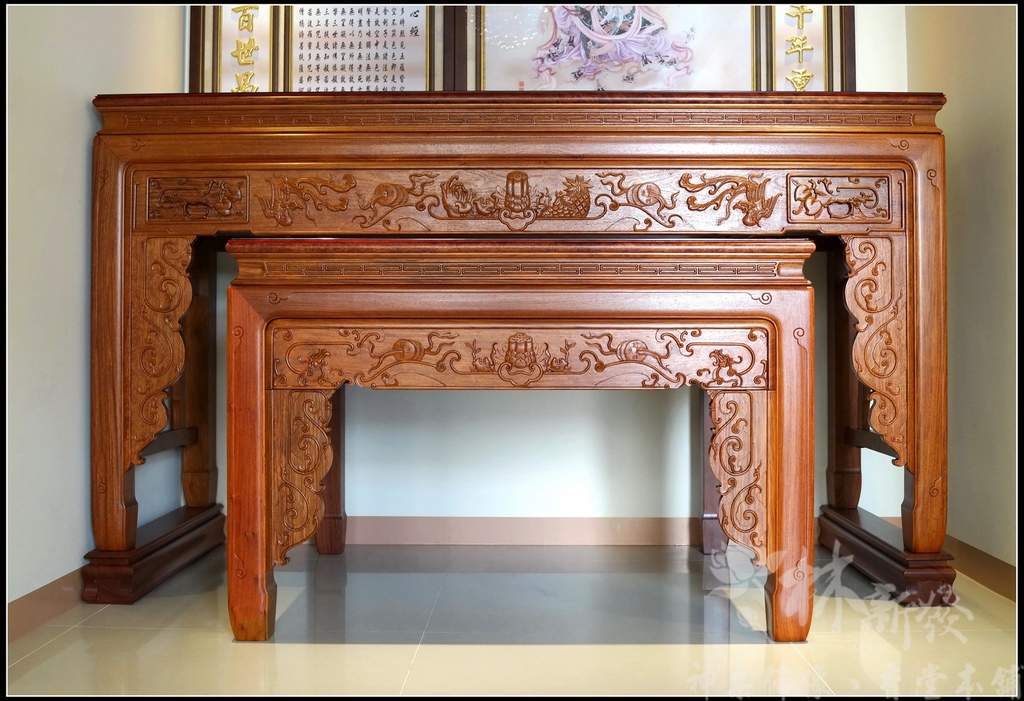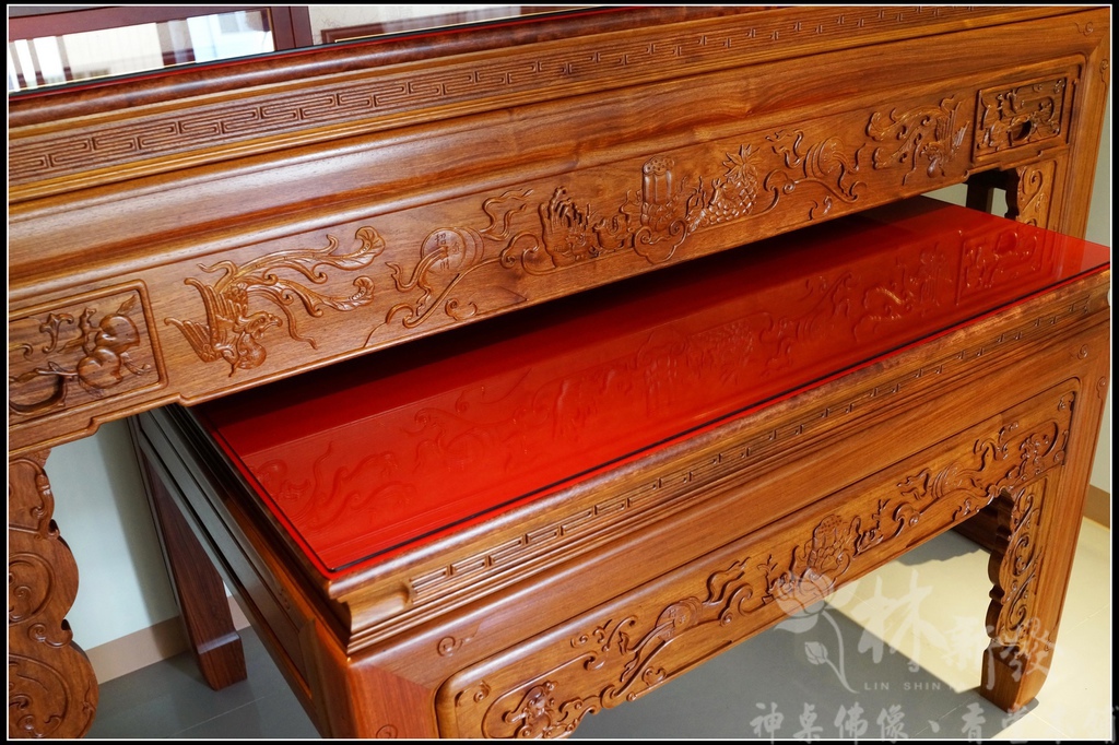 神桌神聯-七尺紅花梨鳳舞敬果漢式神桌(手繪唐式觀音、客製化立體雕刻對聯)