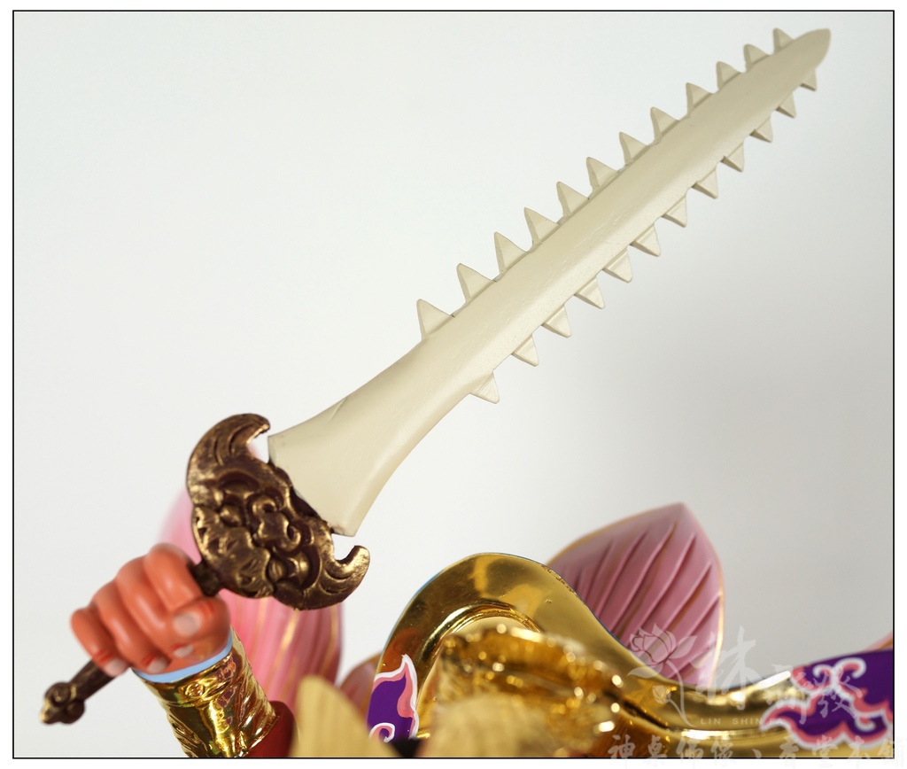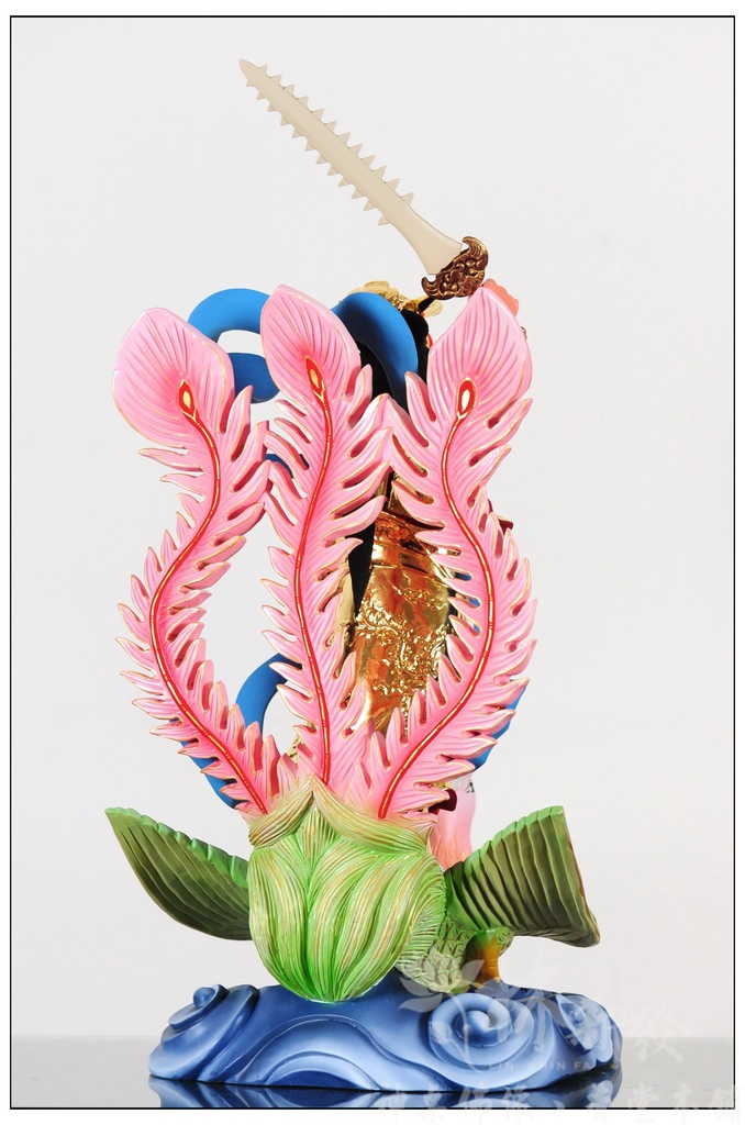 量身訂製的飛鳳九天玄女娘娘作品,手上的鯊魚劍也是木雕而成,阿倫特別做成真正鯊魚劍的色系,就是要符合神明的旨示啦!