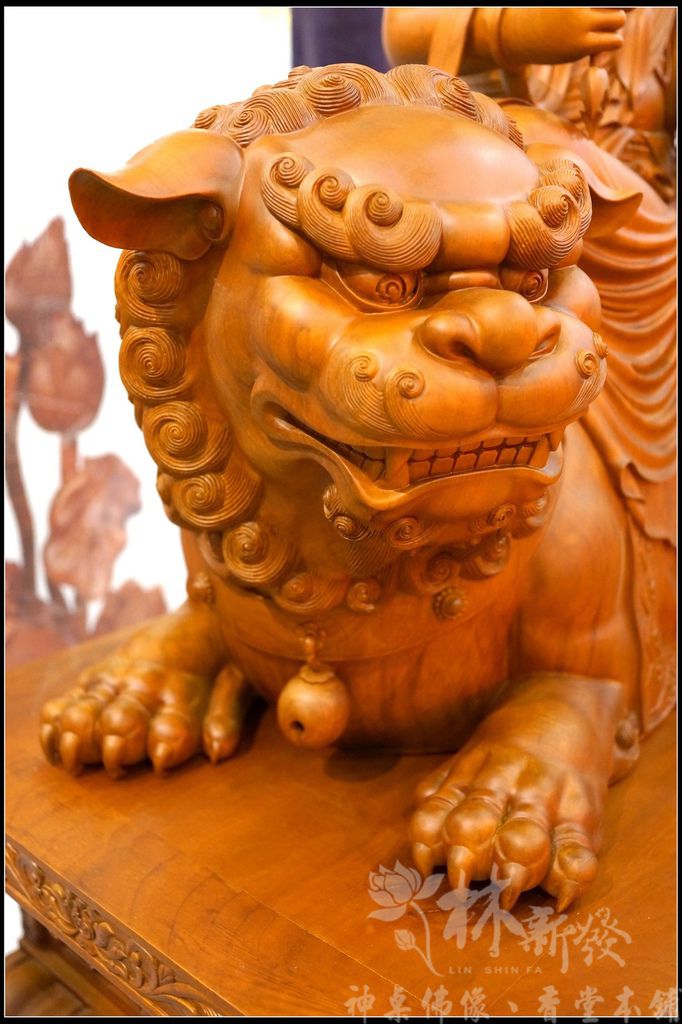 青獅也是活靈活現的創作,不怒而威的神情,配合慈悲的菩薩神韻,整件作品的平衡非常完美。