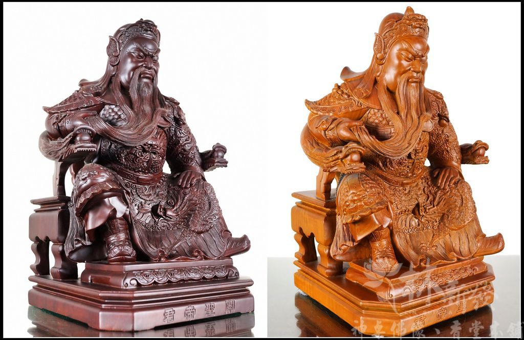 分享關聖帝君!三尊是黑檀作品,最後一尊則是綠檀雕刻,實體的顏色深很多喔!打光下看顏色變淺了不少呢!