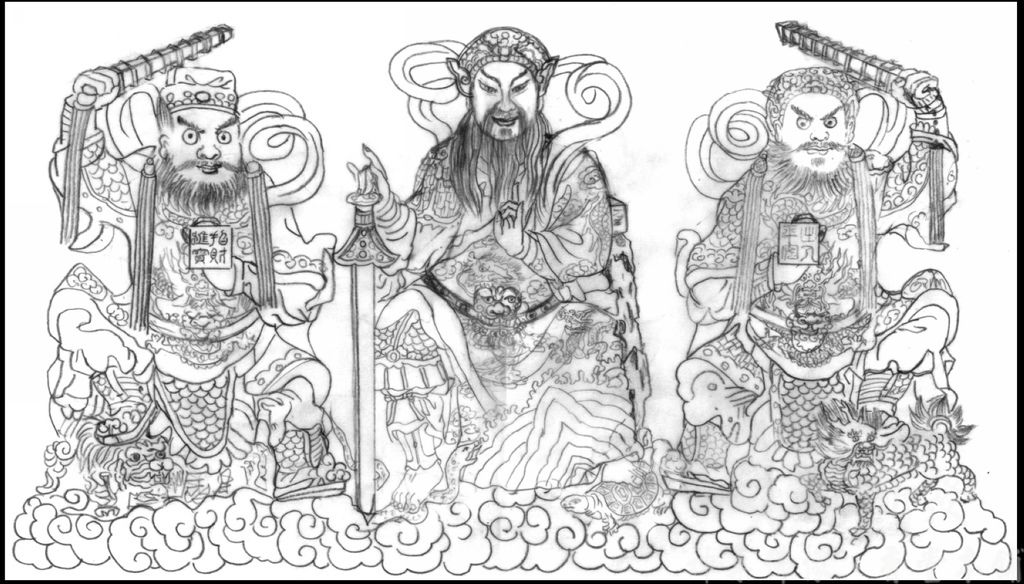 台灣手工繪製作品,玄天上帝(康趙元帥護法),這種特別訂製的客製化神聯,在繪製前都會先打線條圖稿確認