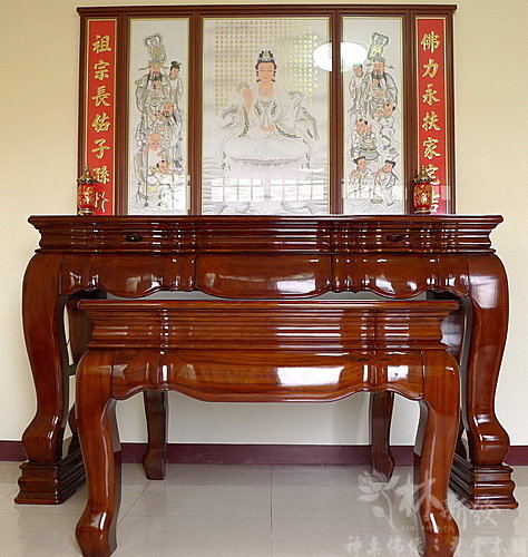 神桌-七尺紫檀-素面大拉米神桌+手繪水墨紅彩觀音聯