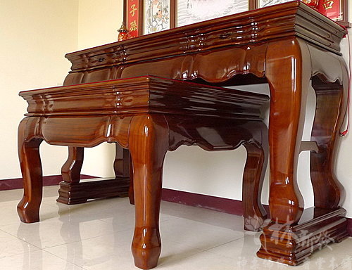 七尺紫檀素面大拉米神桌配上手繪水墨紅彩觀音聯(般若心經)