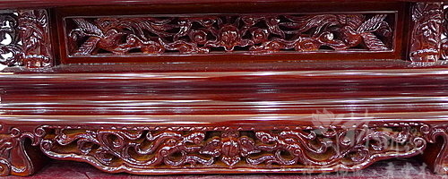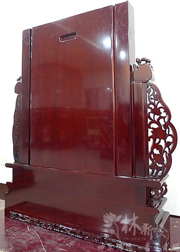 花梨木精雕祖先牌尺寸為:三尺半高、二尺九寬,同樣樣式的中牌:二尺二高、一尺八寬