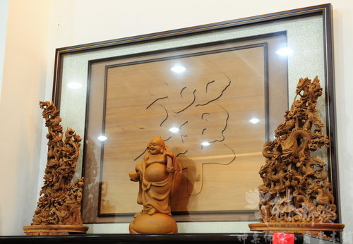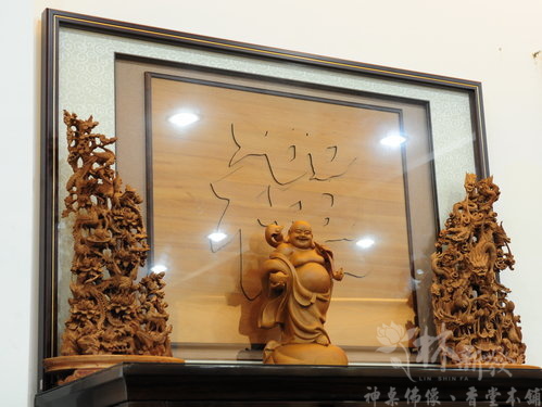中間放的那尊是尺六樟木雕刻如意歡喜彌勒,還有我們收藏的檀香木作品-九龍爭珠、九鳳朝丹!