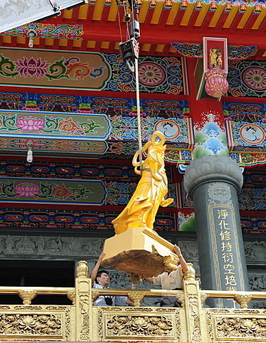 打好底漆後接下來則是要把護法先用大吊車吊上二樓~~之後在二樓才做重新按金,這樣才不會在吊的過程損傷到漂亮的金箔囉!