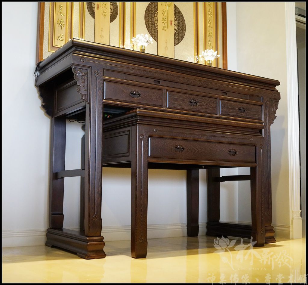 雞翅木明式神桌手工霧面生漆,搭配了台灣手工圓滿心經/觀自在福祿壽雕刻聯,不論是現代或古典裝璜都能完全融入家中的氛圍!