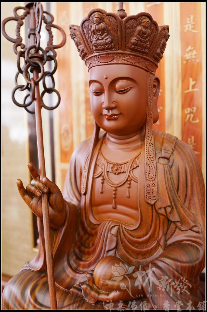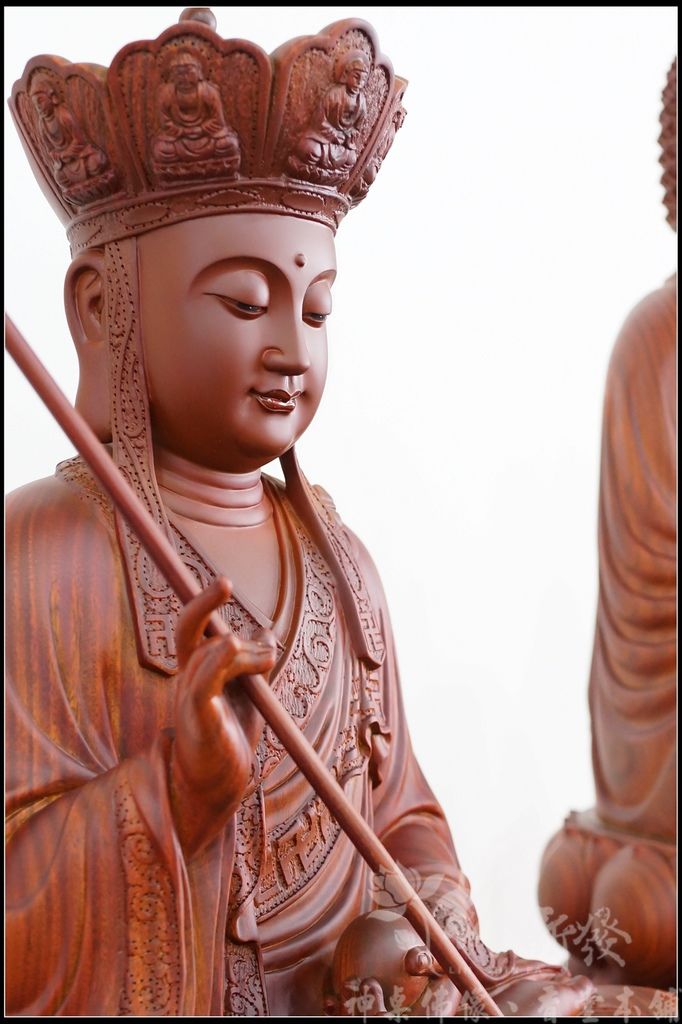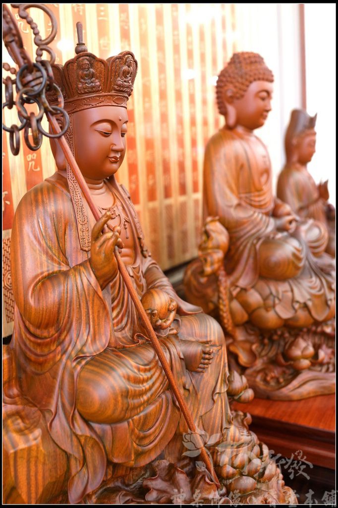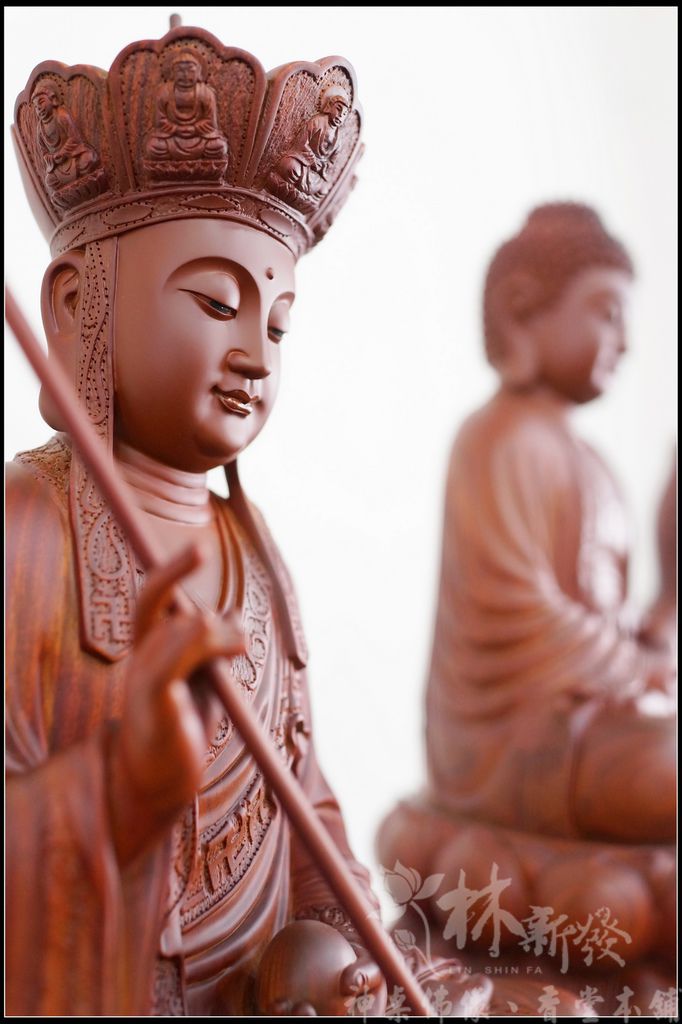 娑婆三聖藝術作品(佛祖/觀音/地藏王)精選綠檀木雕刻創作,水蓮山岩自在體/正體全蓮體。