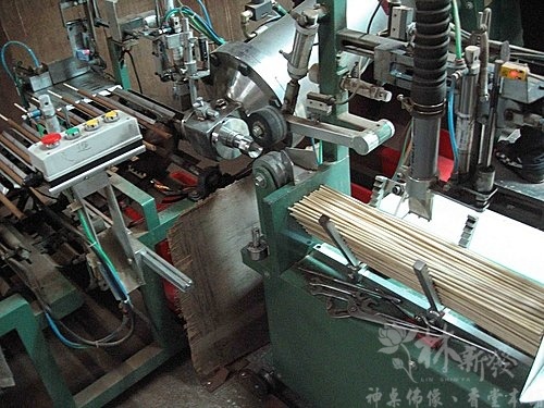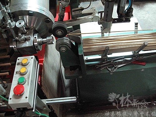 原料就續後,在機器的右手邊放上做香用的竹心,準備完成啟動製香機。