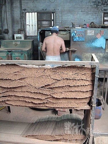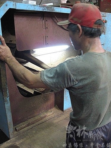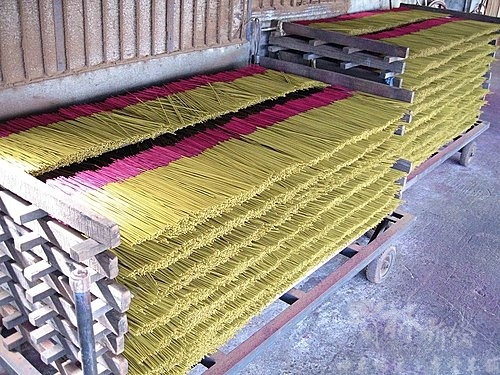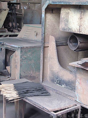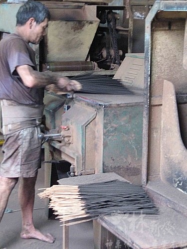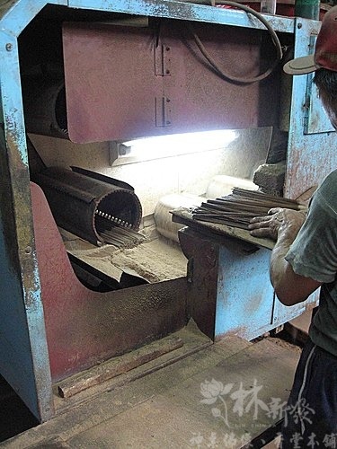 我們做香的方式總共要過四次水,大概分兩大步驟,第一就是把香腳沾水後,在第一台機器上第一層楠樹皮粉,楠樹皮粉的材質很奇特,只要一碰到水就會變得非常有黏性喔,然後放到第二台機器始楠樹皮粉牢固,再來就是重複三次循環的沾水、上粉、牢固,這樣香的基本樣式就出來了。
