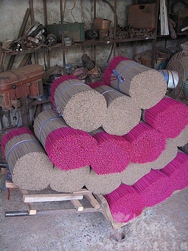 香完成後就要將香腳染成紅色的~~是用紅色顏料來染囉~~