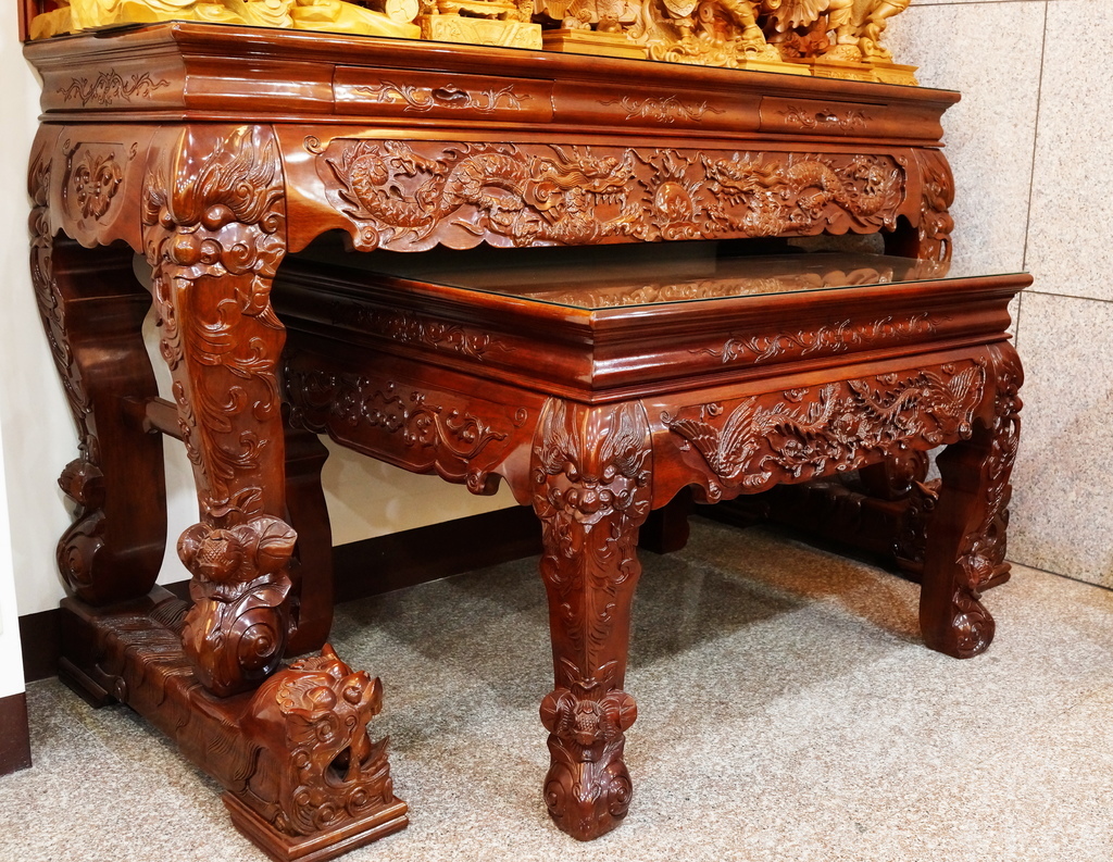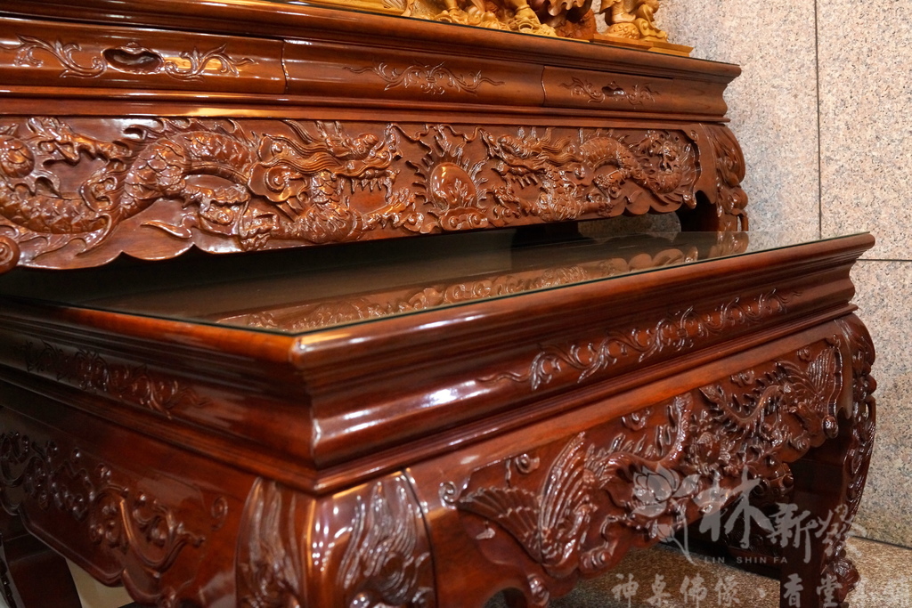 細緻手工的雕刻神桌,上桌以雙龍拱護為意像,下桌雕刻則是飛鳳呈祥