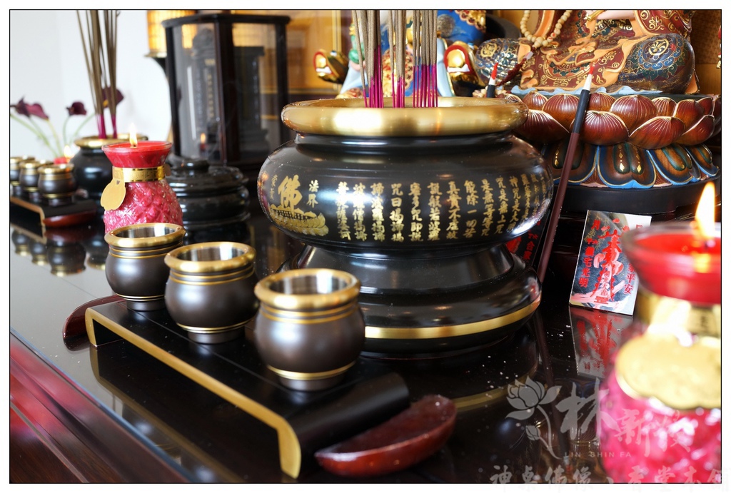 所用的佛俱,是古壂銅器出品的最高等級佛字心經神爐,配上寶華銅器出品的富貴神舍燈,最頂規的佛俱,都在林新發神桌佛俱。