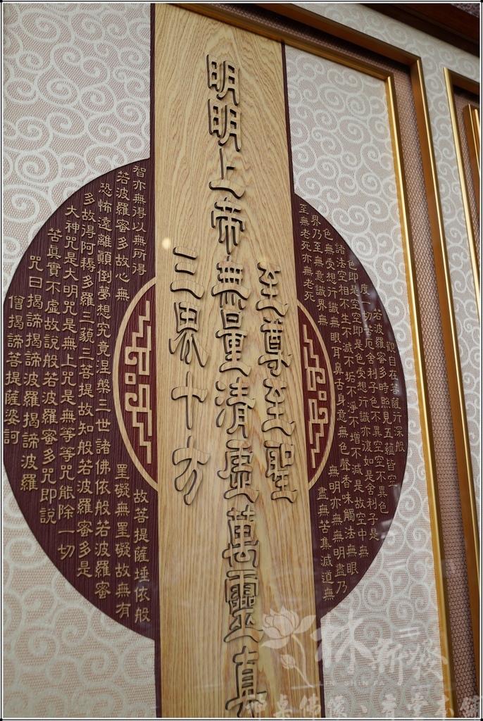 新款一貫道立體雕刻,以「明明上帝無量清虛至尊至聖三界十方萬靈真宰」為主體,倫師還在外圍加了心經雕刻