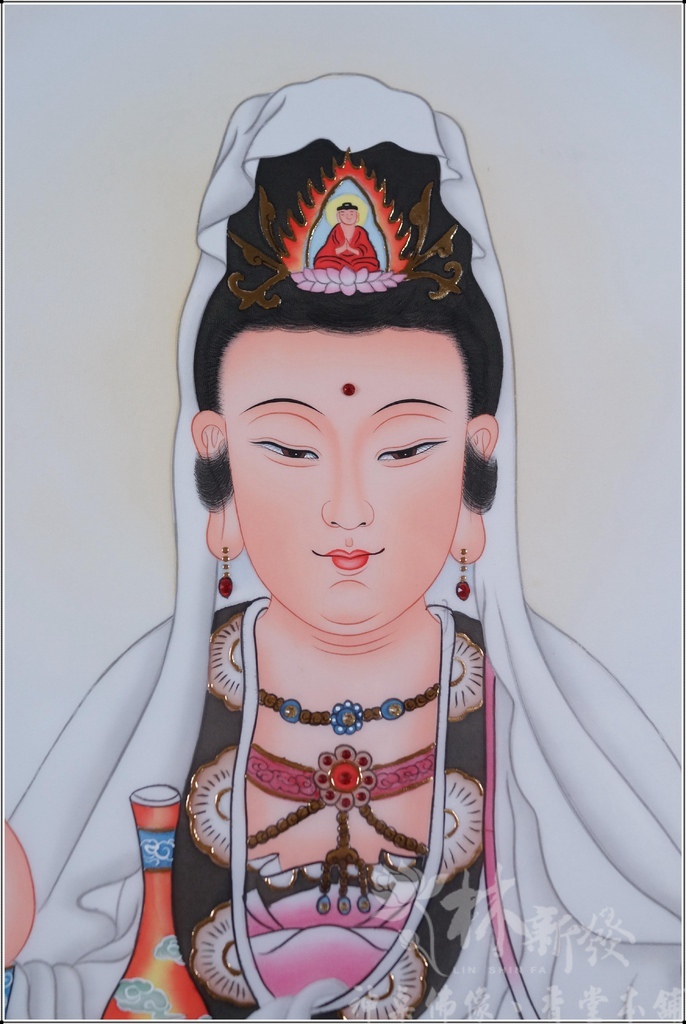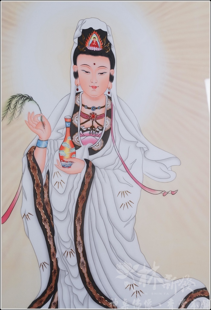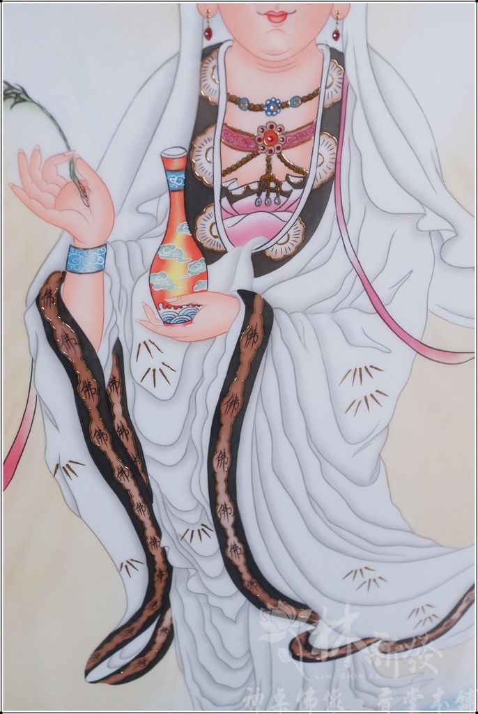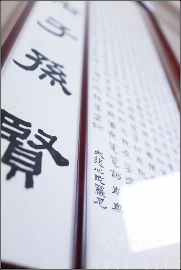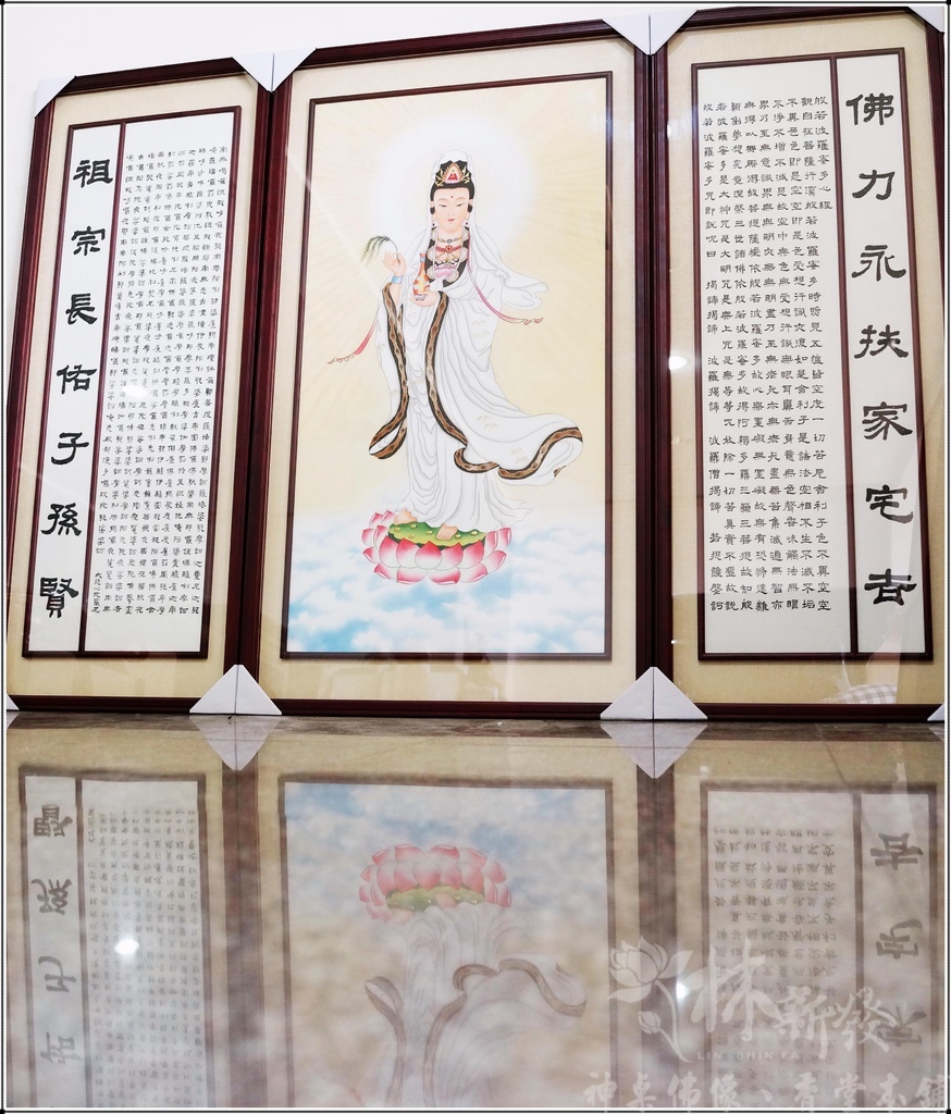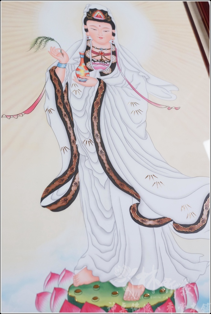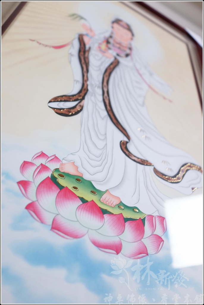 新發佛俱的手繪神聯神彩,立姿觀自在是台灣師傅全手繪綢布底的心血,兩側的墨寶都是倫師特別請求<<<廖大華 >>>老師揮毫落紙~