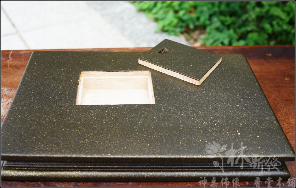 下面是倫師幫財神量身打造的台灣牛樟木雕刻底座,開了一個活動孔,是要讓主人壓財寶的!