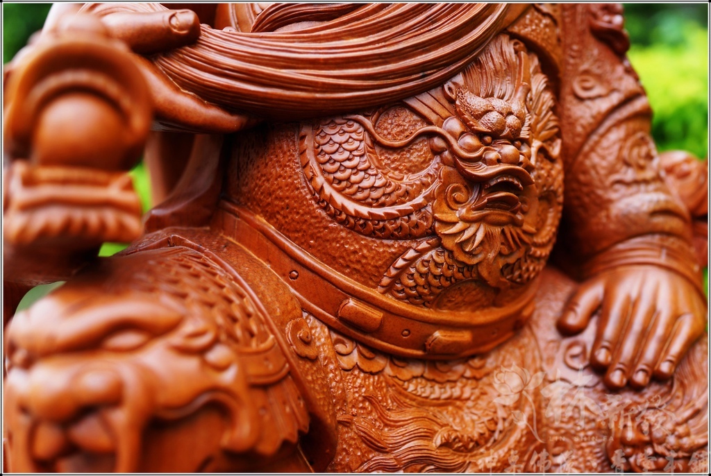 倫師以先人流傳下來的高端紅豆杉原木,創作了獨一無二的紅豆杉錦花一體雕刻「春秋帝君」「正氣帝君」,