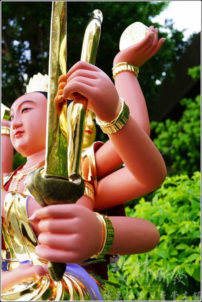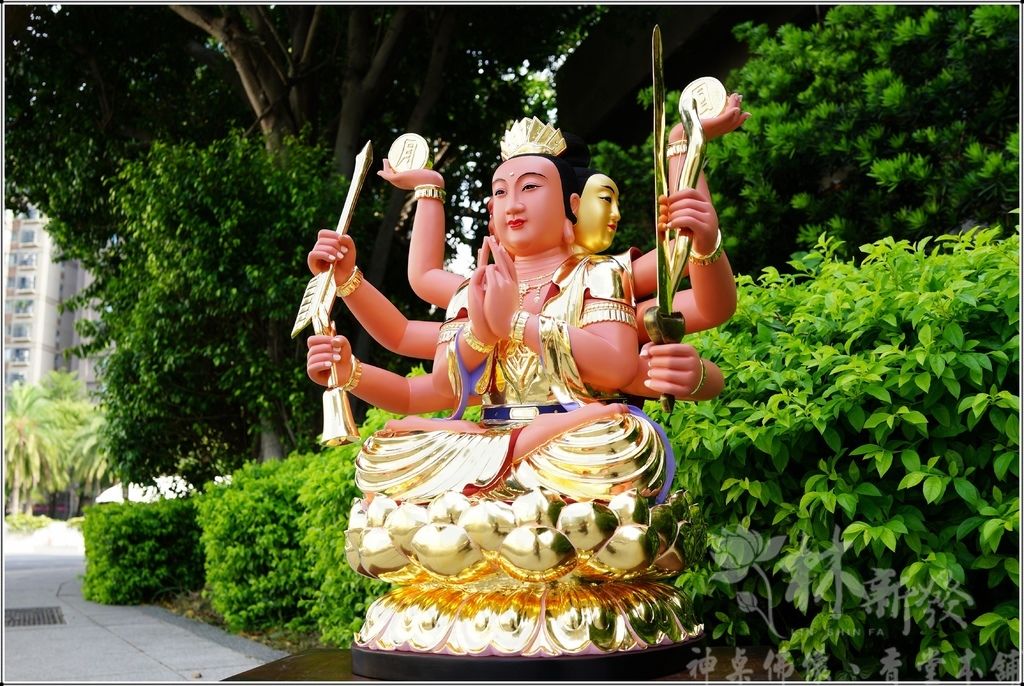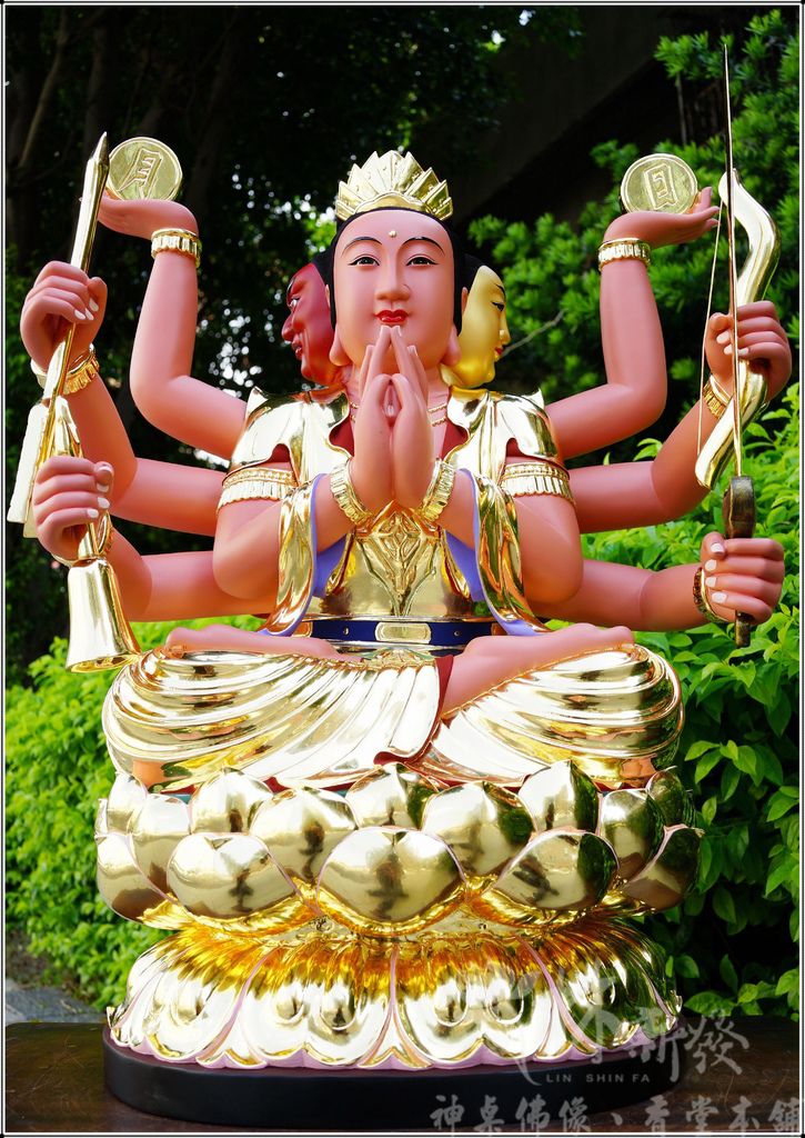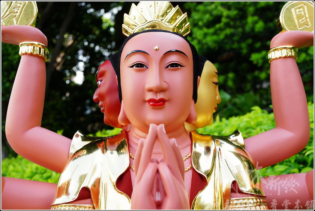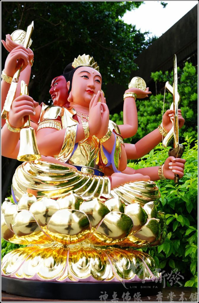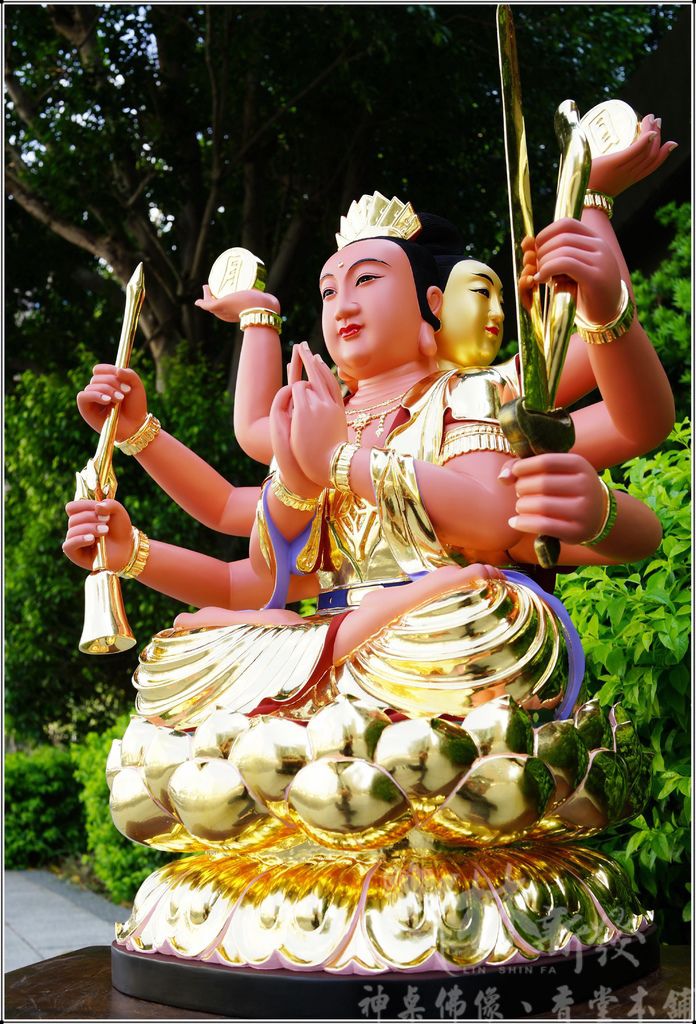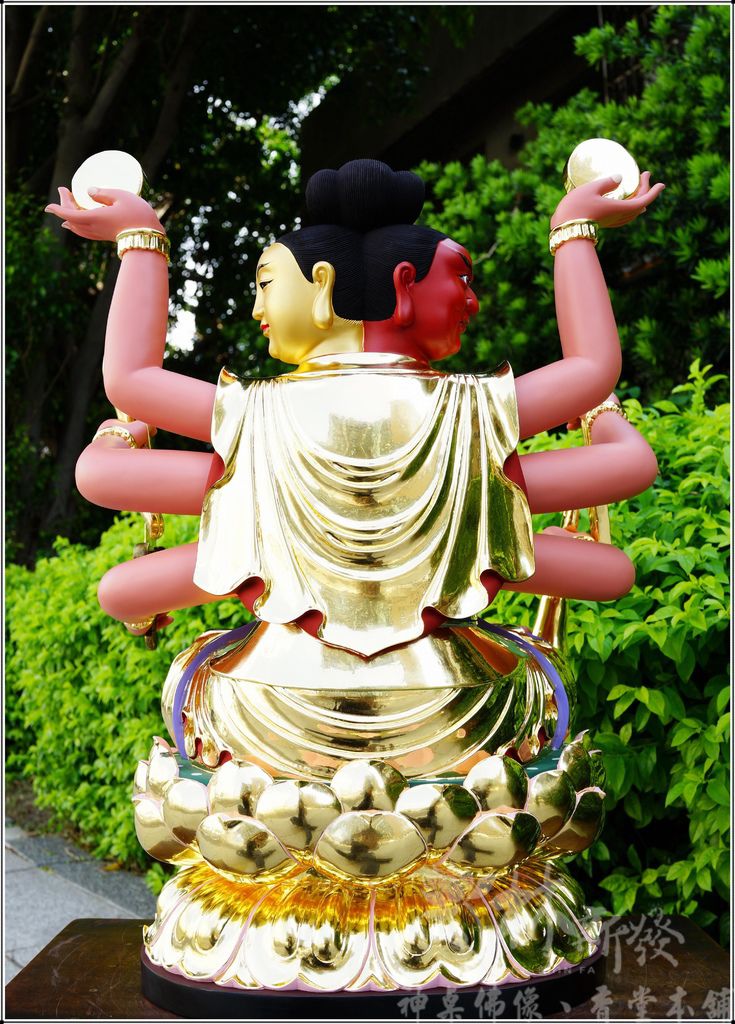 其法相象徵「道體」,手持日月二輪應陰陽二氣,而四頭應四像,八臂應八卦,