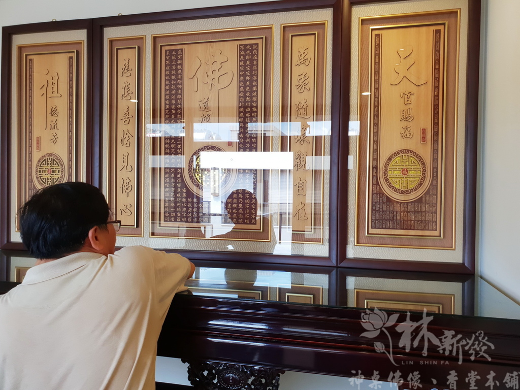 桌上的背板,也是新發佛俱出品的佛道禪心檜木實木雕刻板!要遠從彰化來找倫師買,