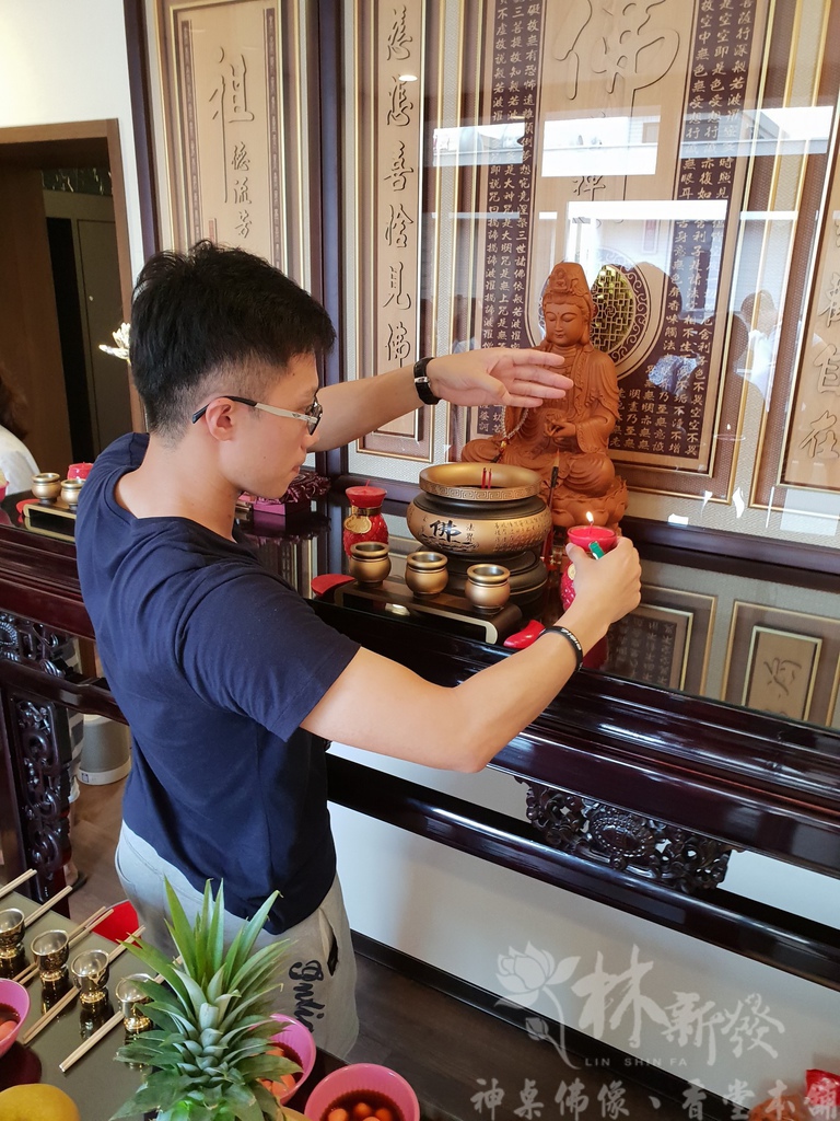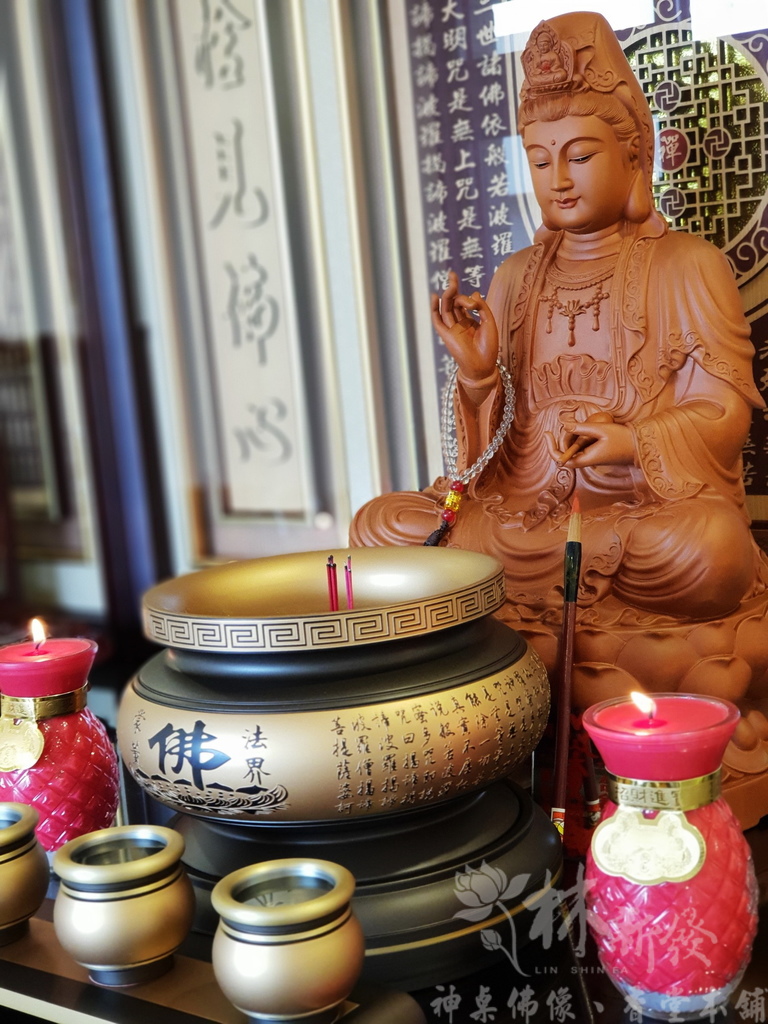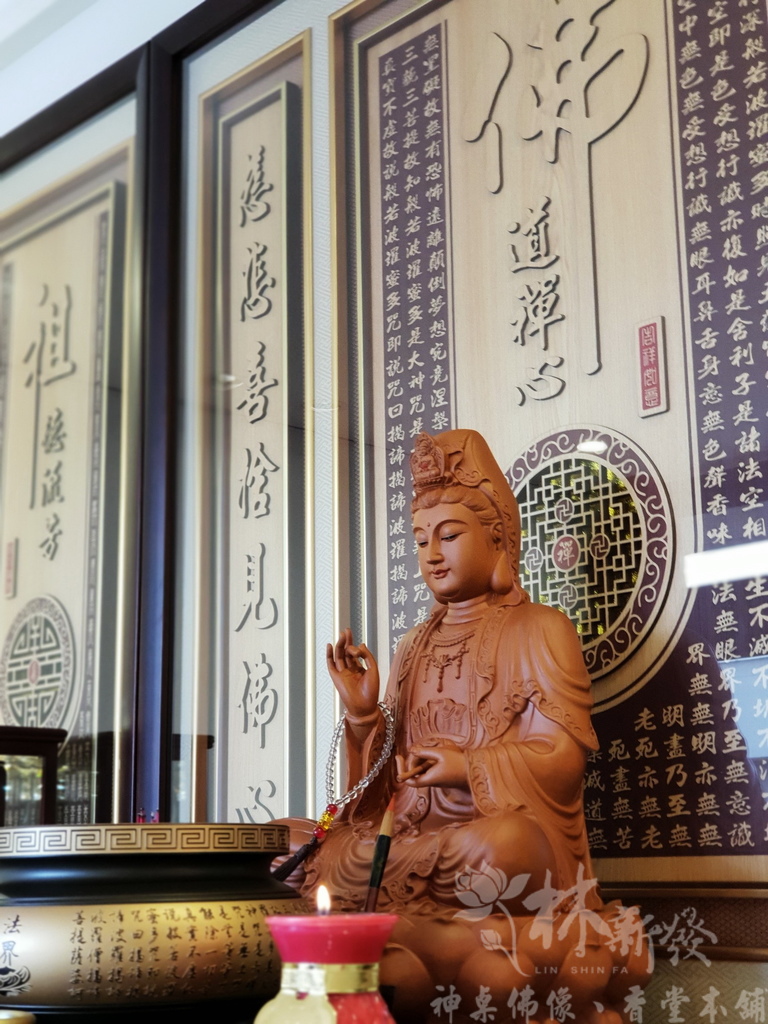 對了,今天出門去彰化幫客戶入宅安香,簡家結緣的金身,也是這件佛法觀音的梢楠木作品喔