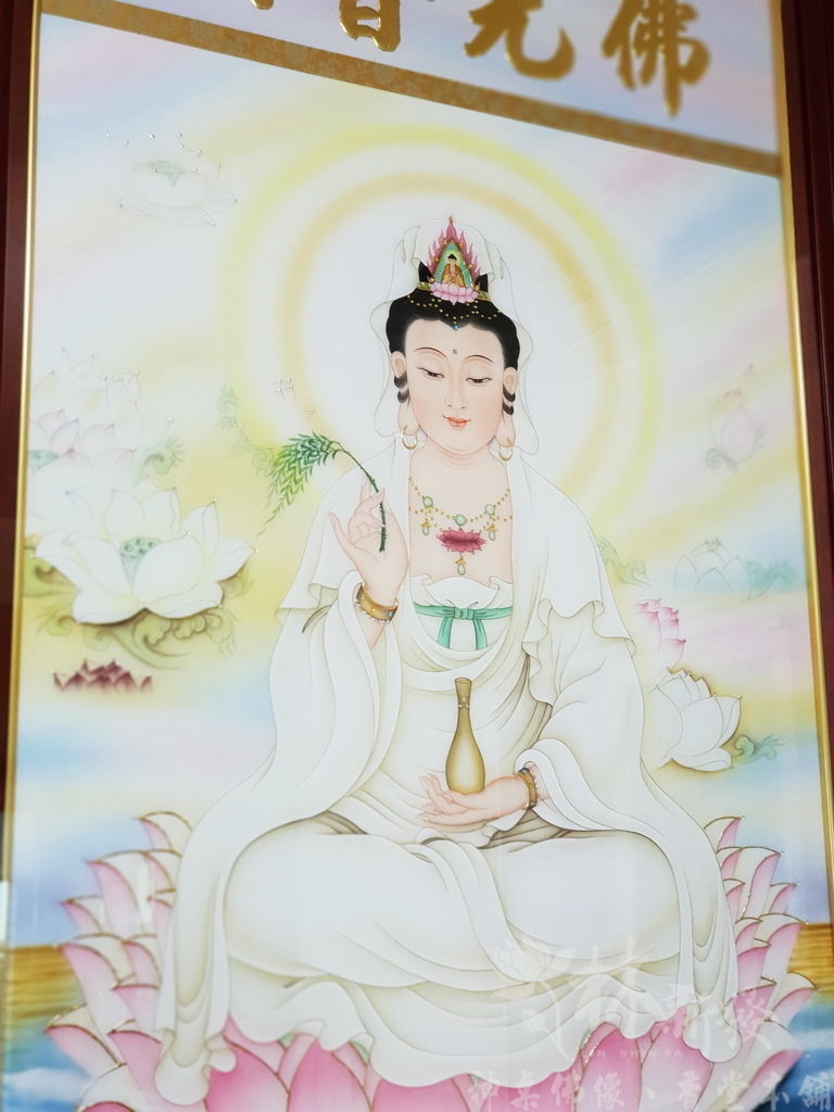 水蓮晶讚白衣觀音大士,在觀世音菩薩的頭上髮飾跟佛祖的火焰上都以手工鑲入很多閃亮的水鑽唷!