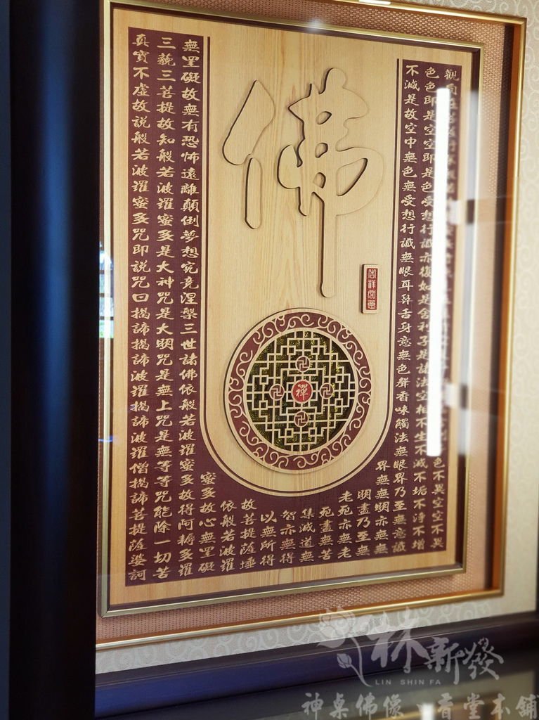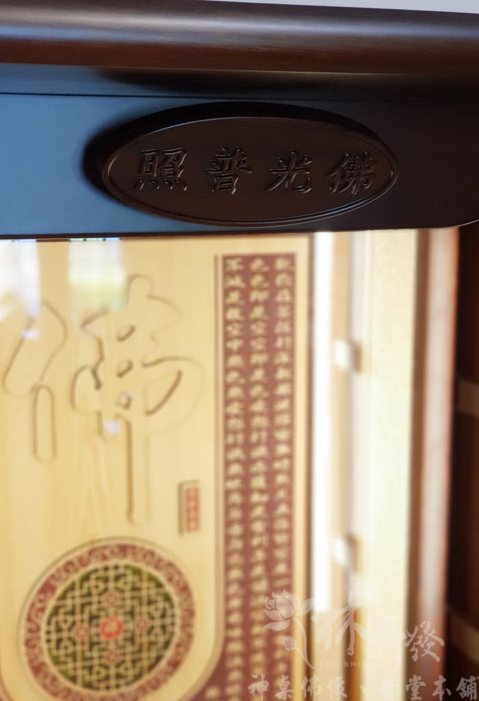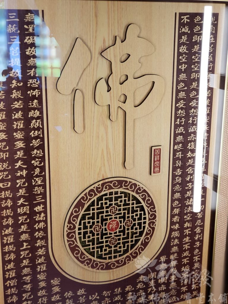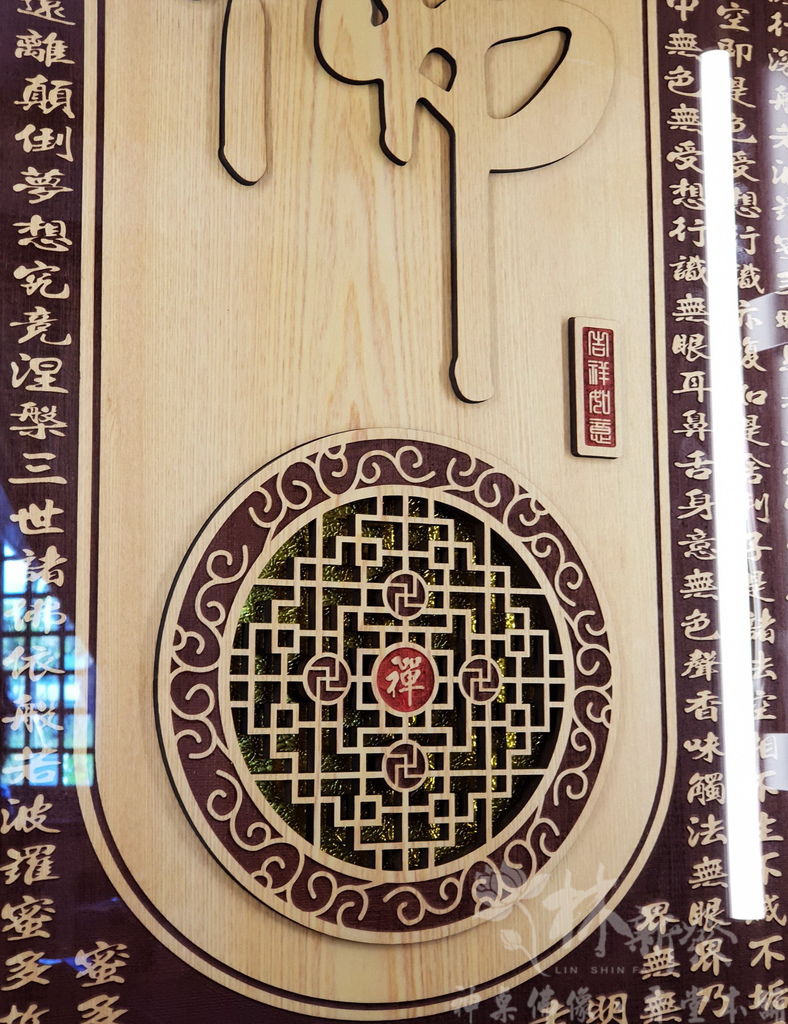 這次的背板,也是為了佛祖而特別設計的,以往這件作品是用「佛道禪心」四個字,這次是以「佛」字來雕刻喔!