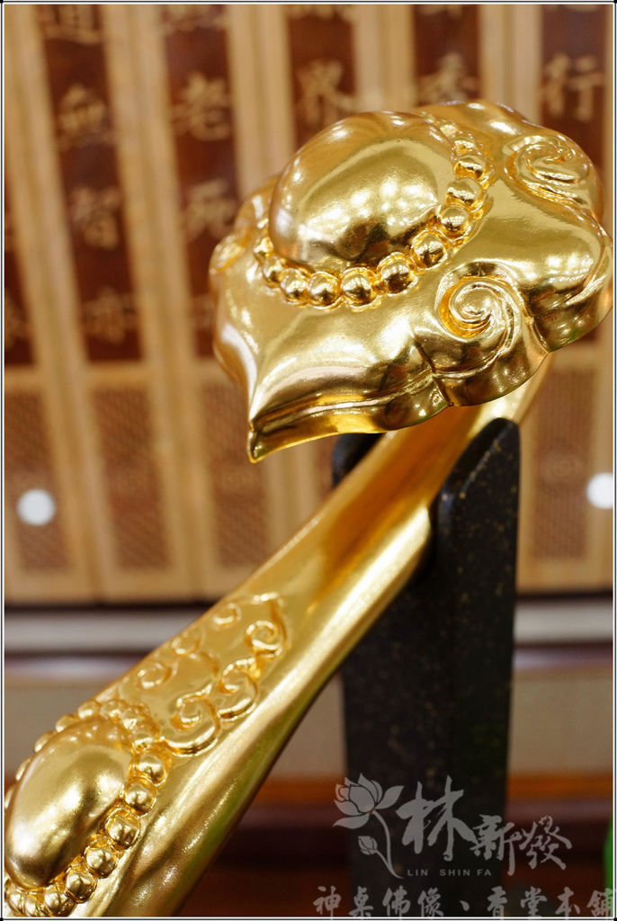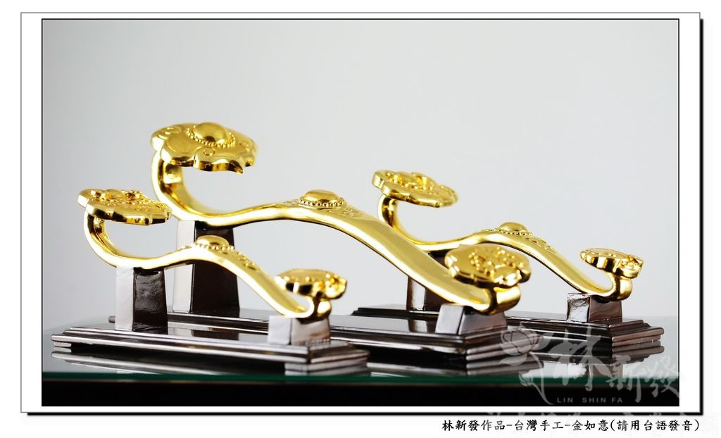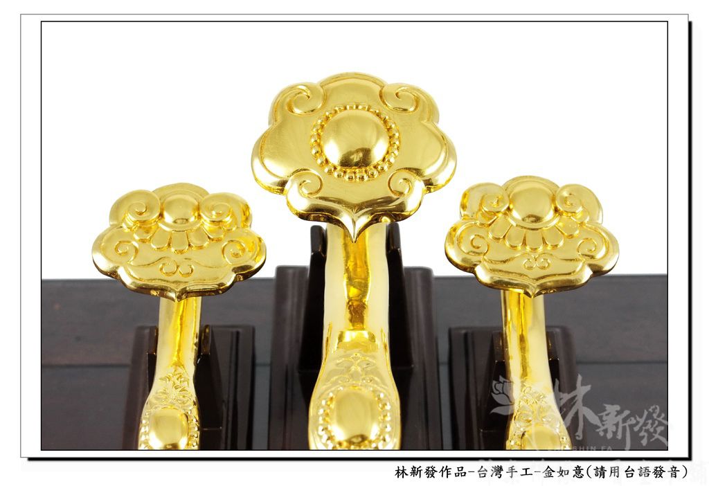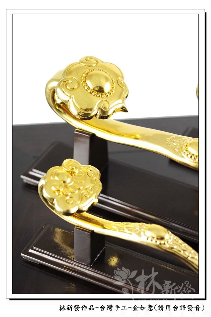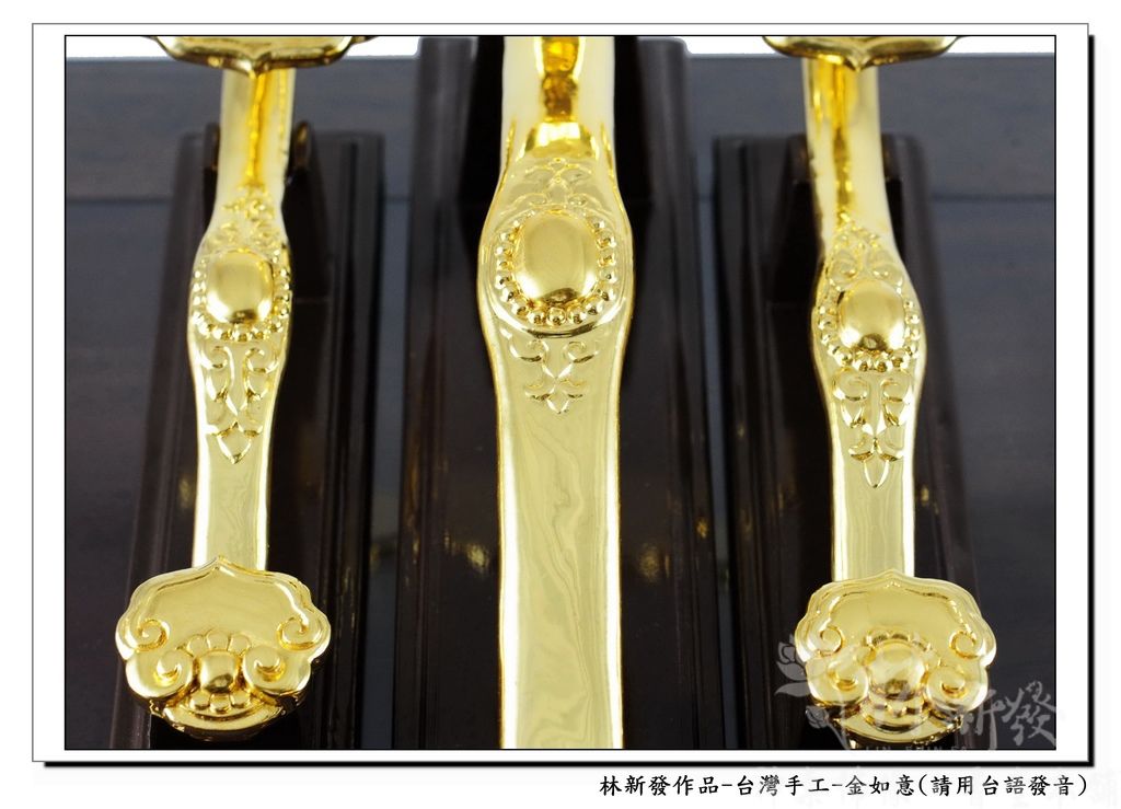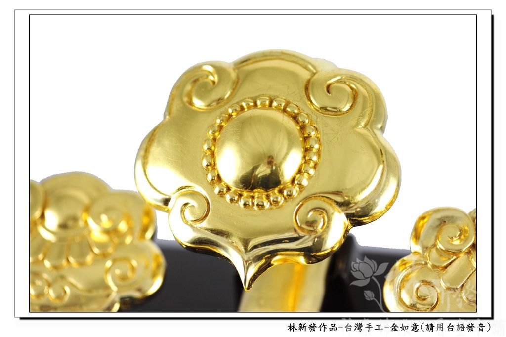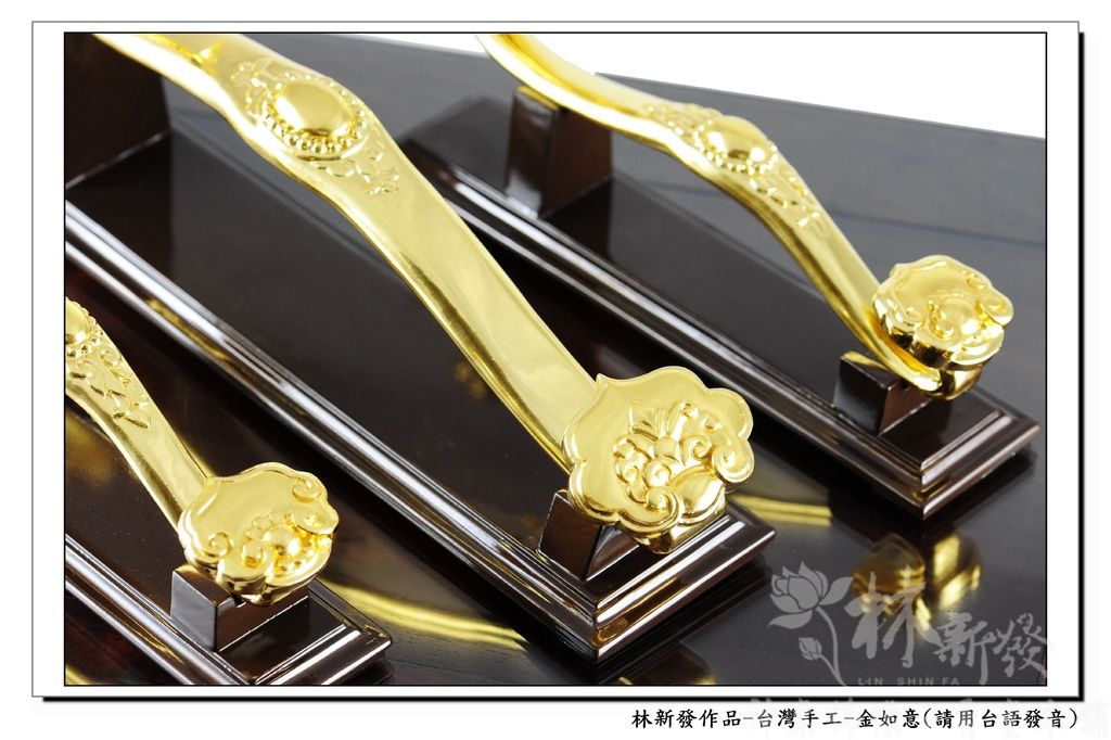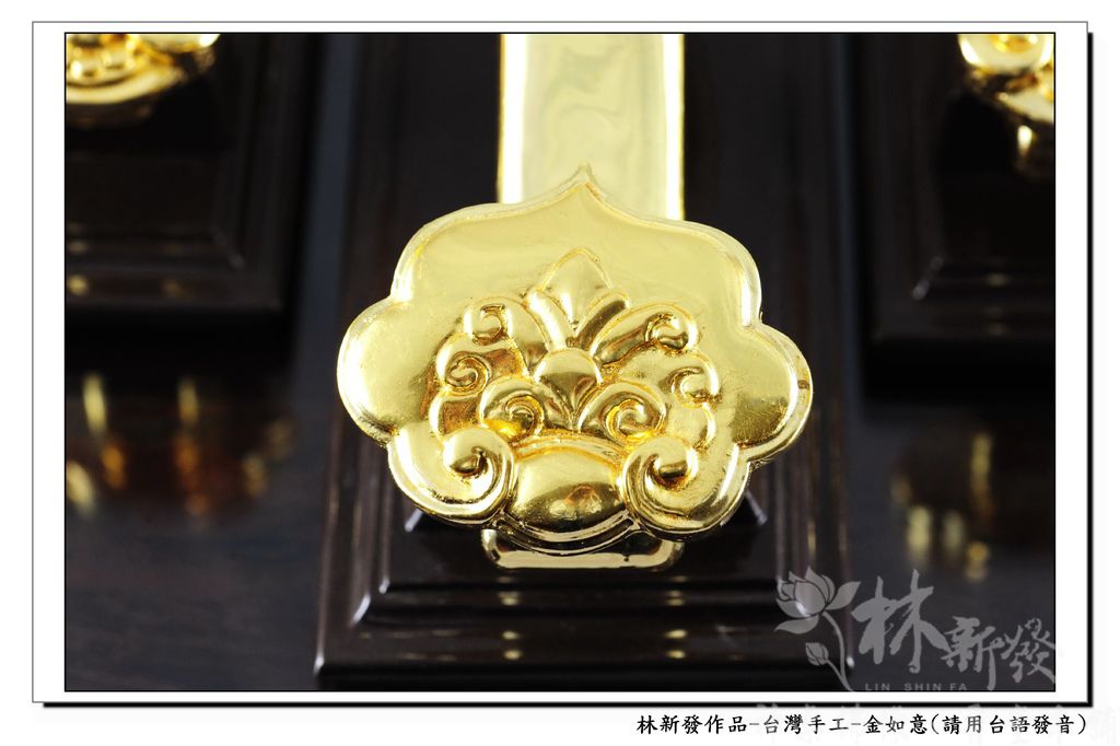 金如意是新發神藝的台灣全手工作品~雕刻完成整把貼上台灣純金箔,再加上防水保護漆~才符合金如意的感覺啦